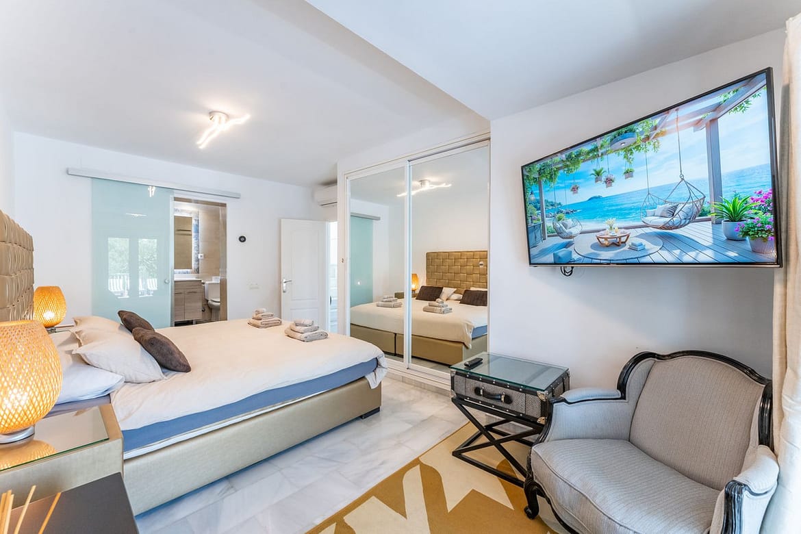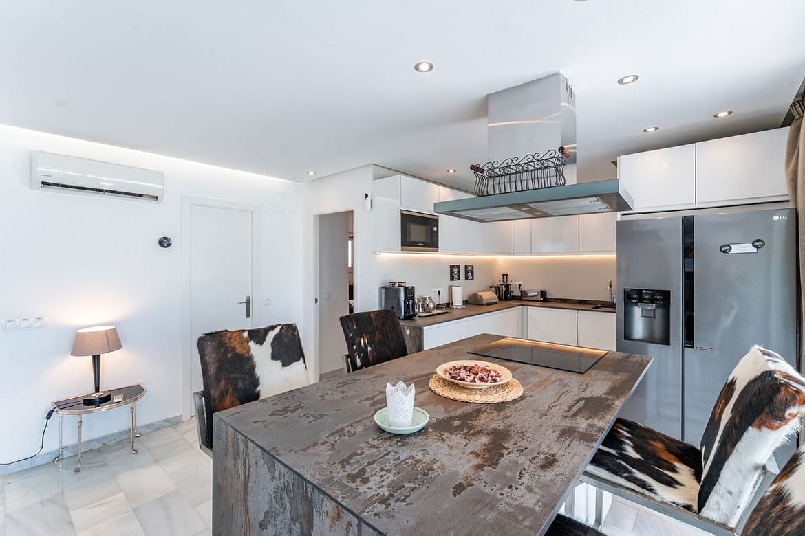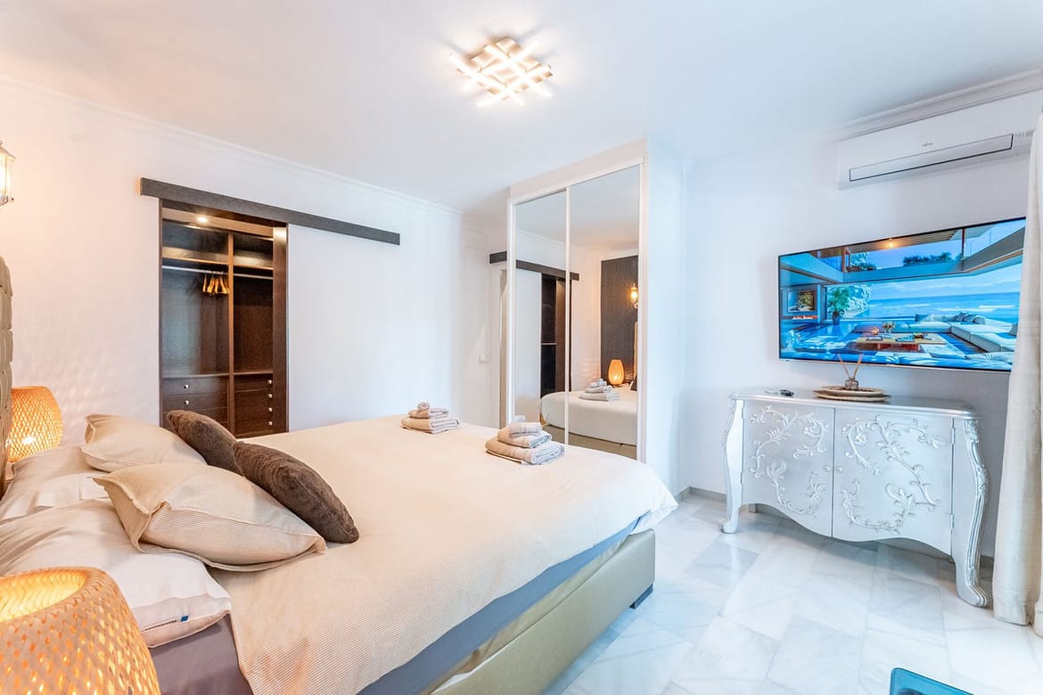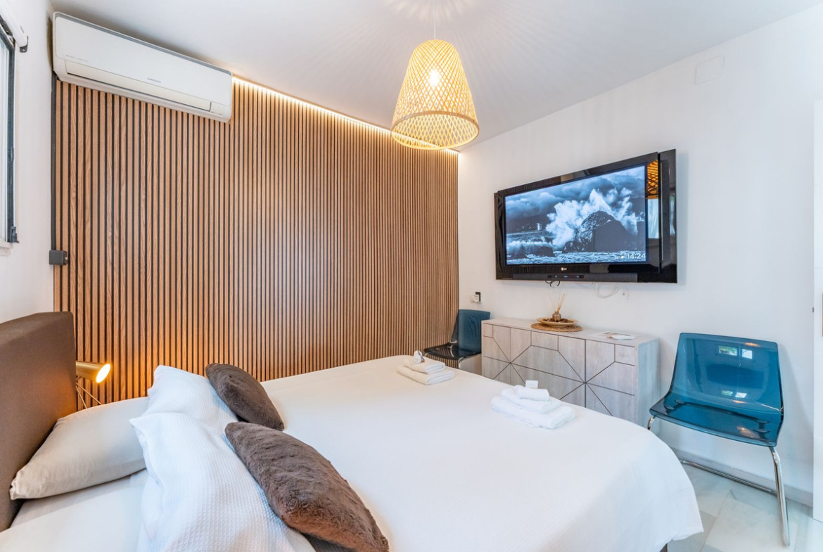 Stunning luxury villa located in the lower part of Calahonda, in an exclusive cul-de-sac surrounded by villas and in a very quiet residential area, just 800 meters from the beach, close to a beautiful natural green area of Calahonda, with breathtaking panoramic views of the sea and mountains. The property sits on a 715 m² plot and offers 232 m² of interior space plus a 70 m² terrace, fully enclosed, equipped with an alarm system and a private garage. The villa features four elegant bedrooms with king-size beds and en-suite bathrooms, marble floors throughout the house, double-glazed PVC windows and doors that provide exceptional natural light in every room. The furniture has been carefully selected and stands out for its sophisticated style and high quality. There are two dining areas — indoor and outdoor — perfect for entertaining. Outside, you’ll find a large heated swimming pool with wooden decking, sun loungers, a chill-out area, and open views that invite absolute relaxation. On the rooftop, the spacious solarium offers a fully equipped bar, barbecue area, jacuzzi, and bar stools — ideal for enjoying unforgettable sunsets by the sea. Additionally, the villa holds a tourist rental license and is successfully rented most of the year, making it an excellent investment with high rental potential. A unique property that combines luxury, comfort, and a privileged natural setting on the Costa del Sol.