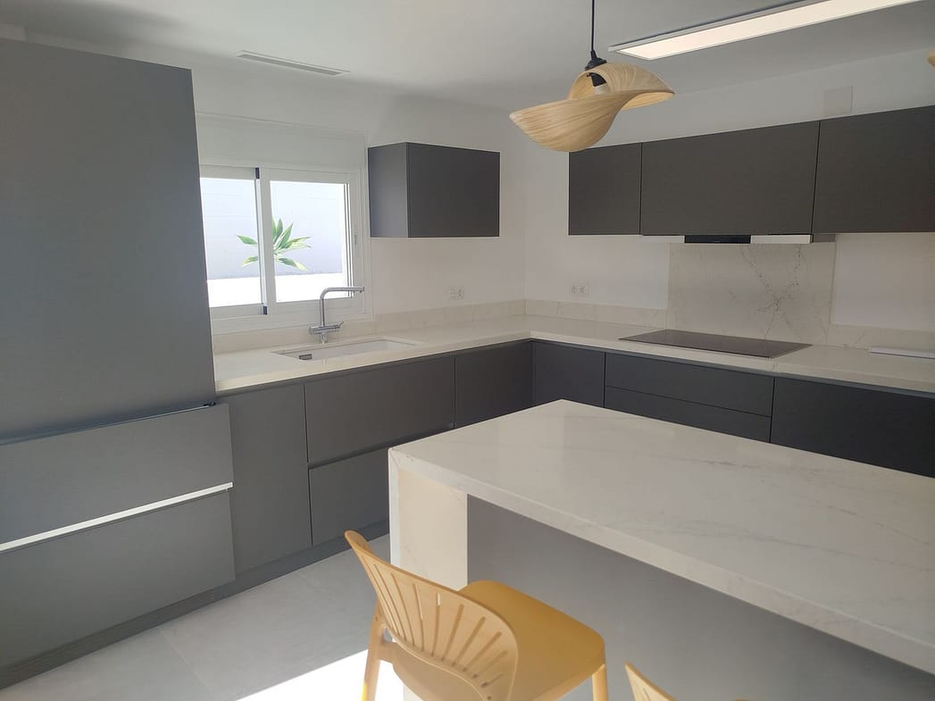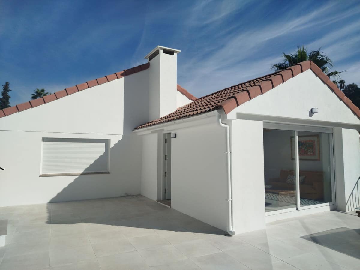 Totally renovated to a high standard and insulated with thermal insulation,you have this luxury 4 bed 4 bath villa in a quiet street in Campo Mijas with landscaped terraced gardens electric gated secure parking electric entrance gate with video entry. There are two large terraces with one surrounding the newly constructed pool. The house has two separate levels with the living room / dining room modern open plan kitchen , 2 large bedrooms both with ensuite shower and bathrooms with under floor heating and guest toilet on the entrance level with another independent bedroom with ensuite showerroom plus a large studio apartment with ensuite and storeroom on the lower level, electric blinds all water electric sewage pipes and wires are new, easy local access to all the bars restaurants of El Coto and Fuengirola set a very quiet area with video entrance and fully alarmed .