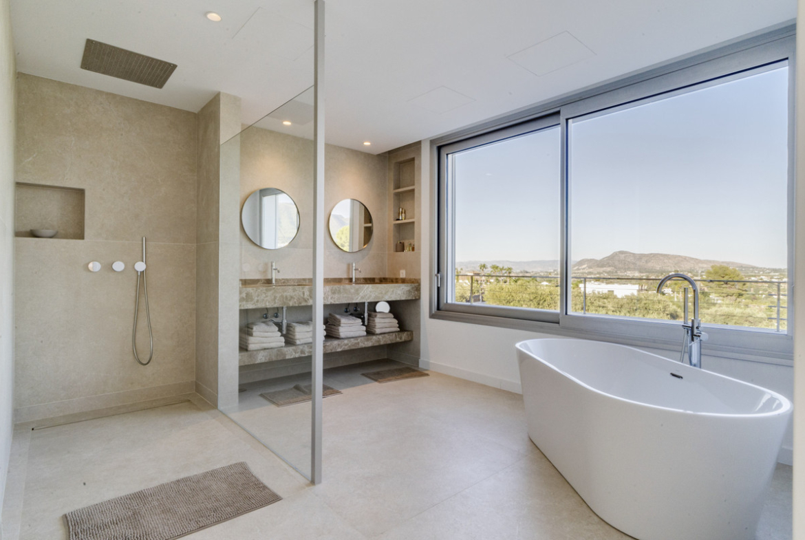 The master suite offers a tranquil oasis, generously proportioned, has it's walk-in wardrobe and and elegant bathroom with stand in shower. Imagine sinking into a warm, soothing bath as natural light pours in through expansive picture windows. From the comfort of your elegant soaking tub, you’re treated to sweeping views of mountains. As the world unfolds outside, you're wrapped in serene stillness — a perfect blend of privacy and connection with nature.