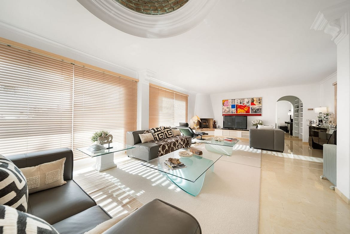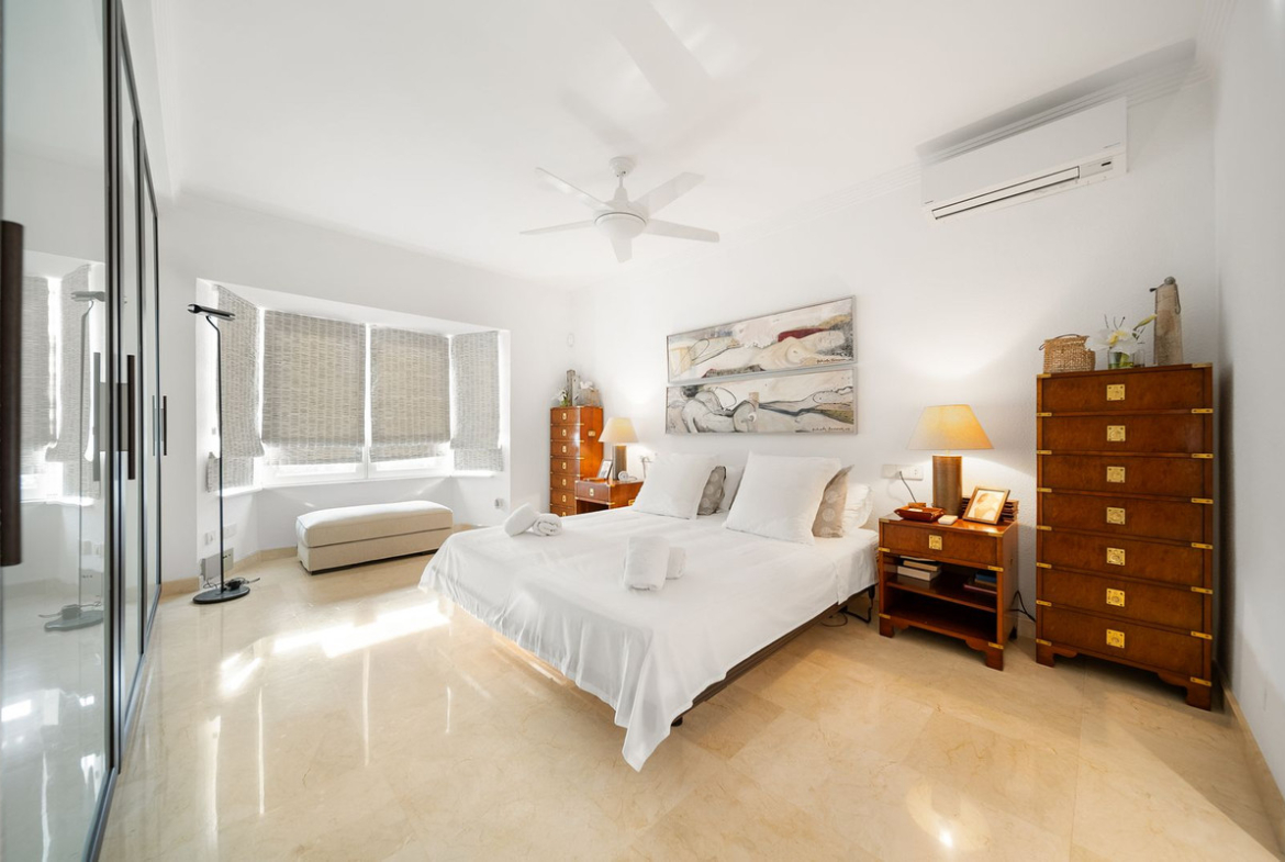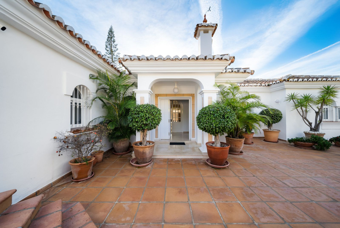 Outside, the property showcases a large frontage surrounded by greenery with a stone fountain as a centre piece, a private swimming pool with capacity of 48 m3 with an adjacent washroom / toilet, a large double garage and additional parking on the drive. There is also a large store room. With a plot size of 1,000 m² and 300 m² of constructed area, this villa is a rare find in the area. Built in 1986 and maintained in good condition, it includes fitted wardrobes, a storeroom, and modern heating and air conditioning throughout. Don't miss this opportunity to own a piece of paradise with unparalleled golf and sea views.