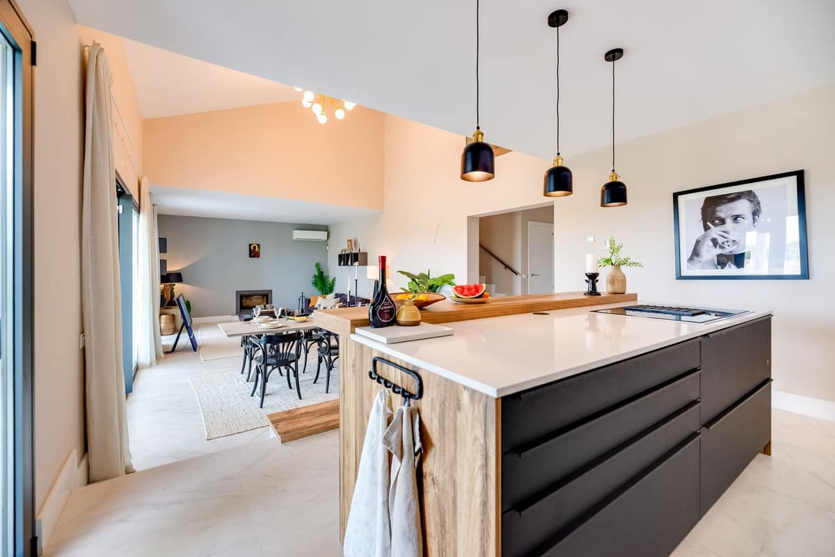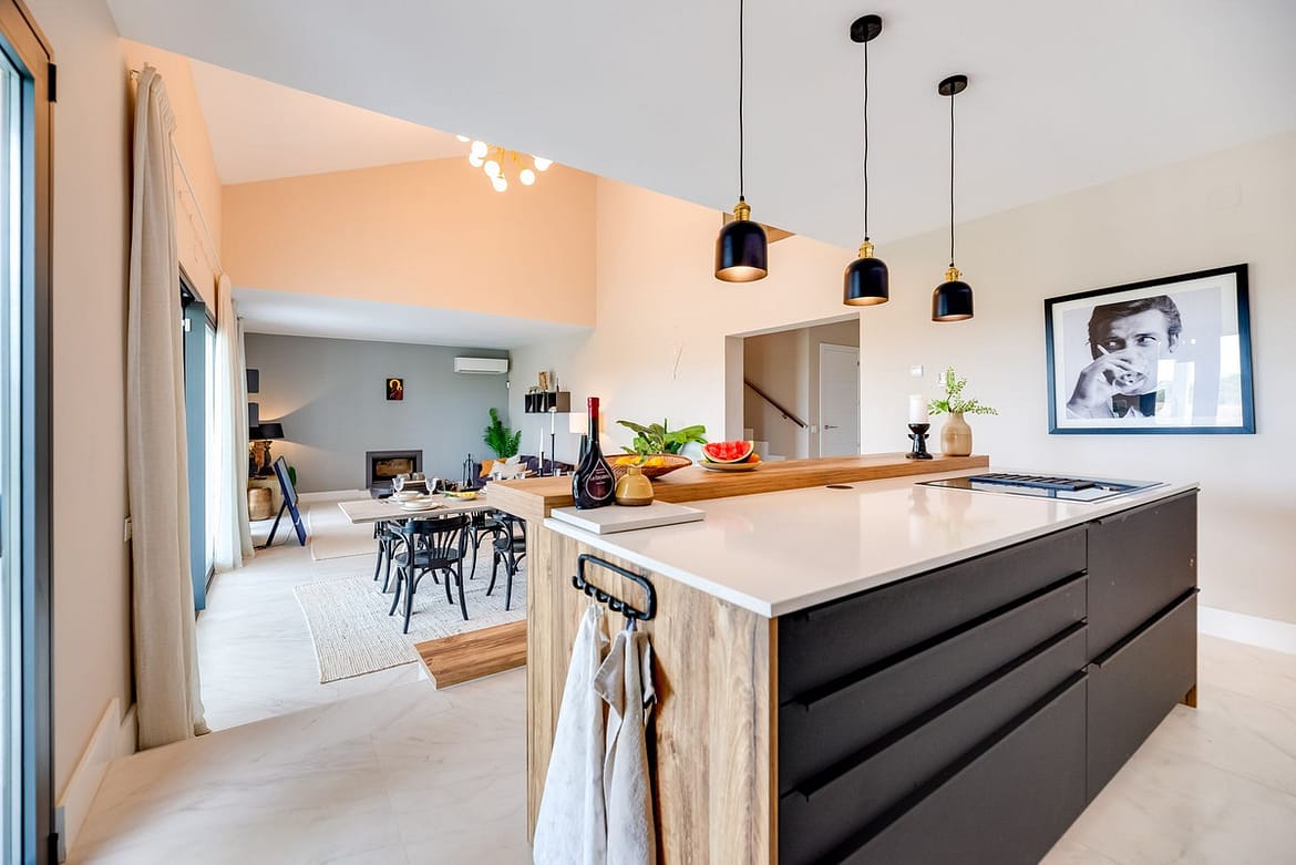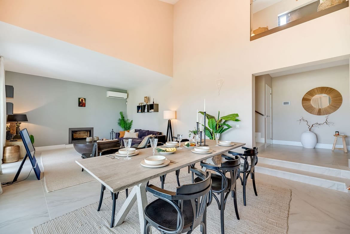 The living room includes a cozy fireplace and TV area, connected to a stylish dining space and a fully equipped designer kitchen with a spacious island — ideal for entertaining or family moments.