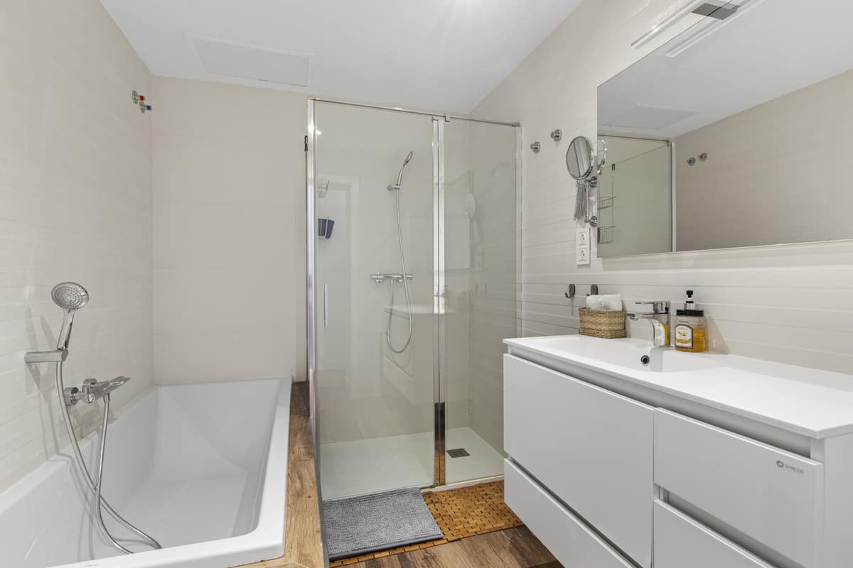 Two of the four bedrooms enjoy ensuite bathrooms, while all benefit from ample storage and natural light. The home is equipped with central heating and air conditioning, ensuring year-round comfort. Outside, the property continues to impress with a covered terrace with beamed ceilings, tiled sun terrace, and a large, private garden facing east—perfect for morning sun. The fenced swimming pool provides peace of mind for families, and the outdoor areas invite relaxed Mediterranean living.