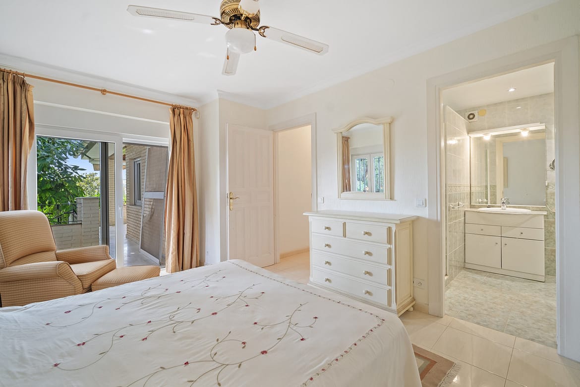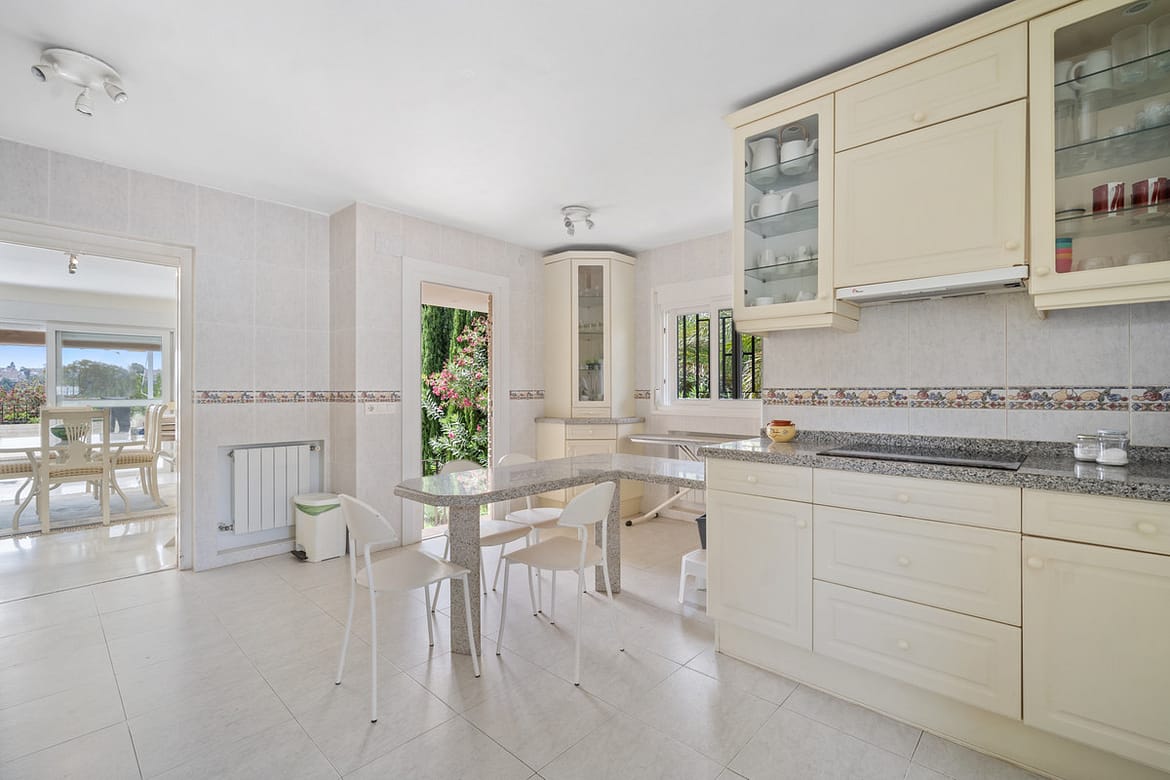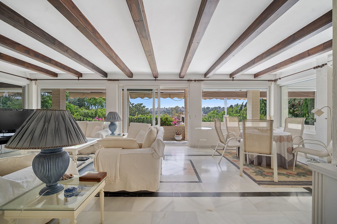 This villa is nestled in an elevated position within the urbanisation of Guadalmina Alta, a beautiful and well-established urbanisation known for its quality living. This villa boasts stunning panoramic views due to its well-designed elevated position on a sizeable plot. The entrance to the house is graced by a picturesque patio, adding to its charm. On the main floor, you will find a beamed, generously-sized living room with cozy fireplace and a dining room offering access to a delightful terrace. Additionally, this floor accommodates two bedrooms, a bathroom and guest toilet.