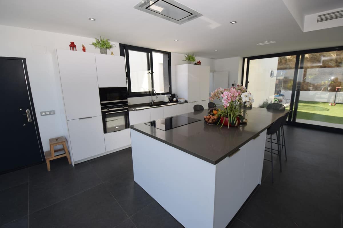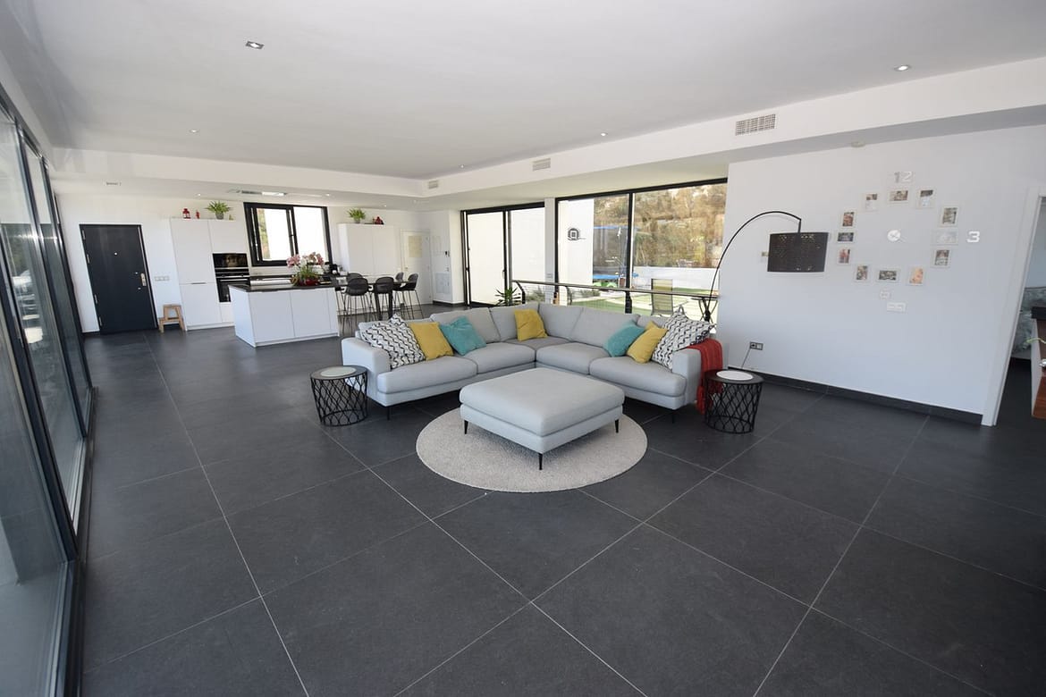 Fantastic contemporary villa located on the world renowned La Cala Golf Resort with breathtaking views of the surrounding countryside and all the way up to Mijas Pueblo. Entering the villa you are presented with a very impressive, open plan kitchen / lounge / dining area with a central island in the kitchen and a fire place in the lounge area. Both sides of this beautiful living space have floor to ceiling windows to ensure the property is flooded with natural light all day long. Also on this level is a guest bedroom with ensuite shower room and direct access to a private terrace. From the kitchen area you have direct access to a large open terrace, a perfect area to enjoy the expansive views over some lunch or possibly a nice cool glass of wine. There is also a double garage with direct access to the kitchen and a rear terrace with artificial grass beautifully set up as a childrens play area with various activities. From the lounge area you access the lower level via the floating staircase where there is a cosy sitting area with fitted wardrobes, two guest bedrooms that share a bathroom with a sunken bath and finally a wonderful master bedroom with floor to ceiling windows on two sides and an impressive ensuite shower room. All the bedrooms have fitted wardrobes, electric shutters and direct access to the outside terraces. Both floors of the villa have independent hot and cold air conditioning to ensure you can maintain the perfect temperature all year round. On the lower terrace there is a heated six meter Jacuzzi swimspa, perfect for exercising or relaxing, depending on your mood. If you prefer a swimming pool it is possible to replace the Jacuzzi with one. The villa is accessed via a large driveway where there is parking for several cars. La Cala Golf Resort has three 18 hole golf courses, a golf academy and practice range, club house, hotel and spa, restaurant and tennis courts, all easily accessible from this wonderful villa.