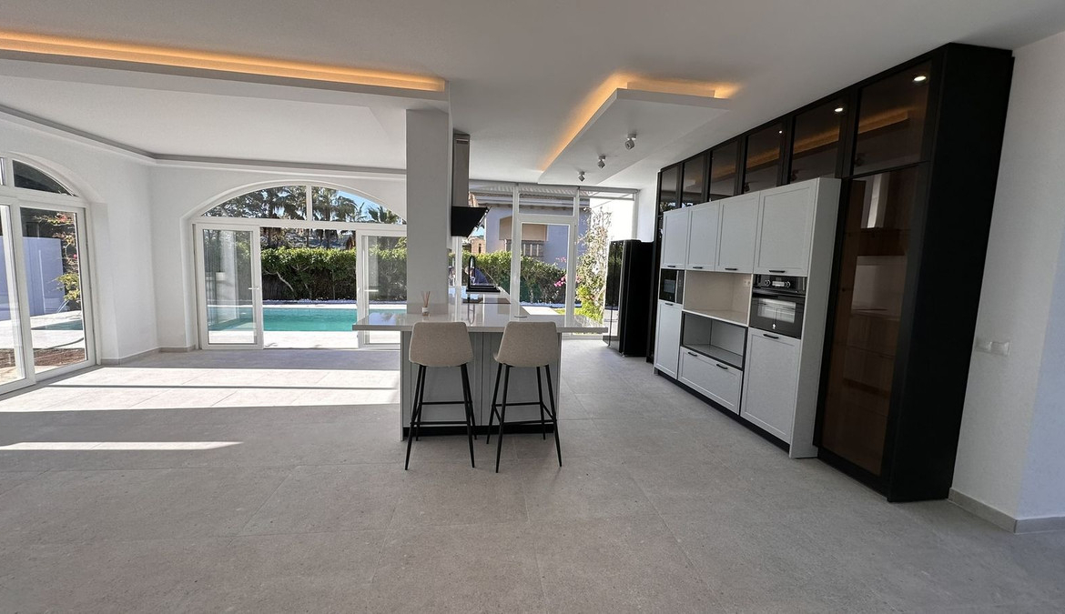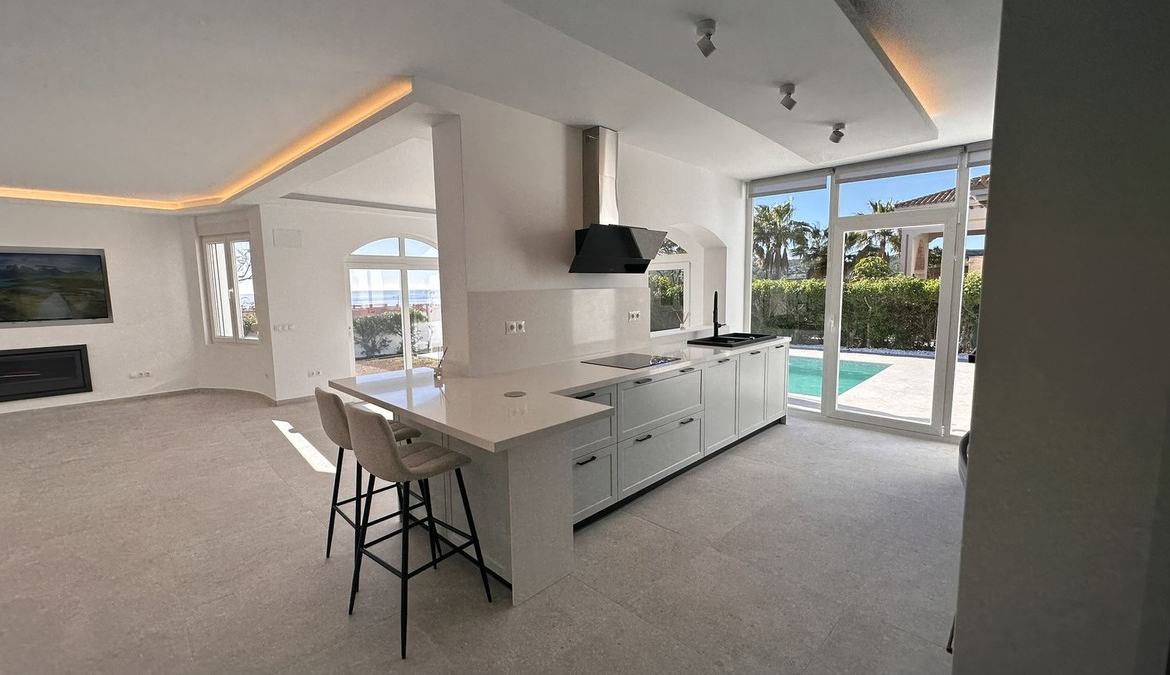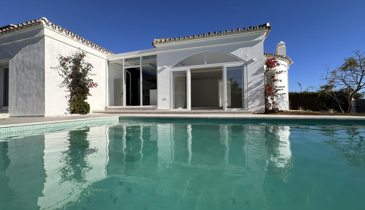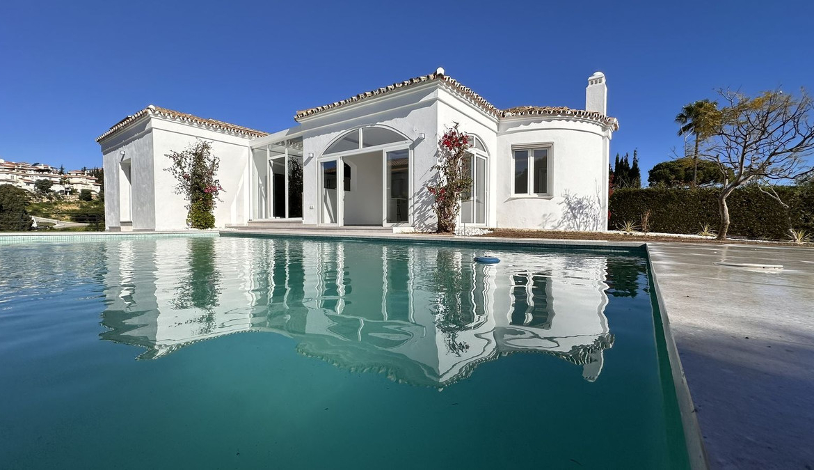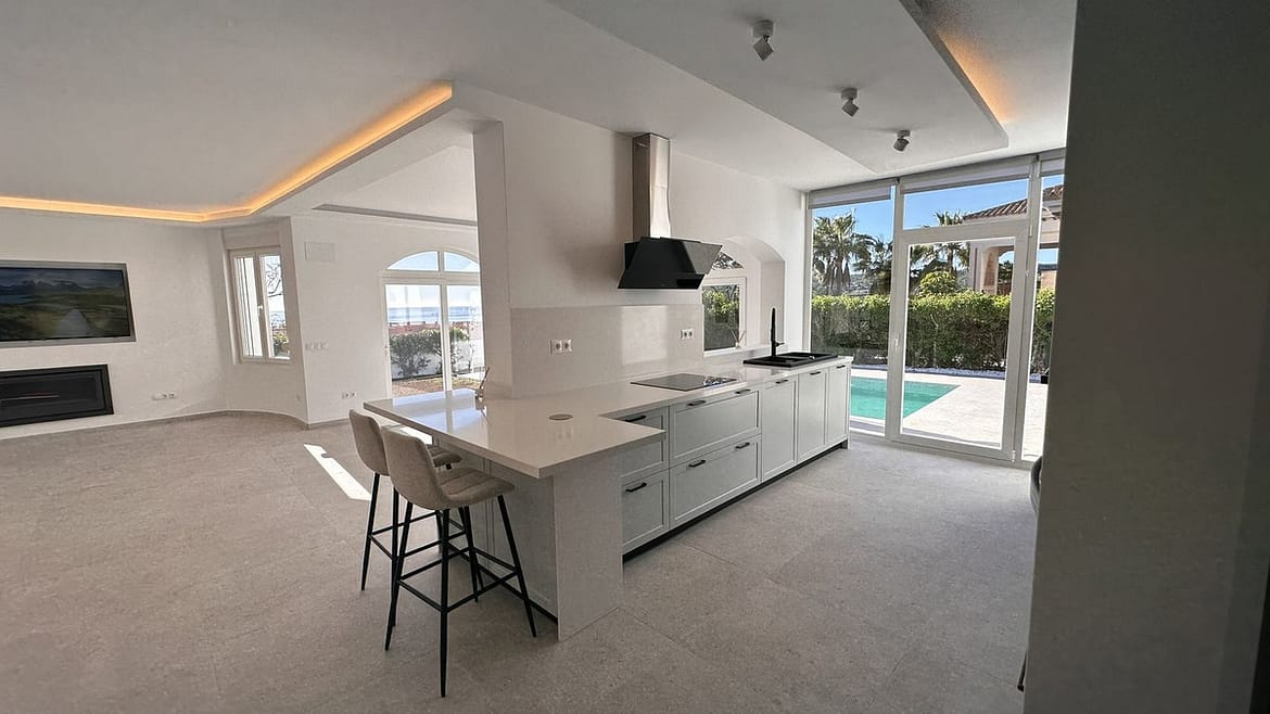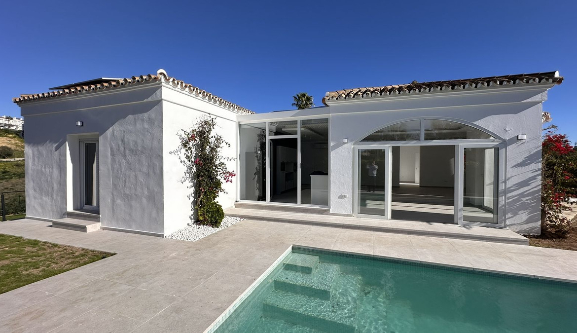 Fully renovated luxury villa on a large private plot with views of the green area in an established and desirable residential area, La Duquesa. This single-story villa has 4 generously sized bedrooms, all with private bathrooms. Spacious open plan living room, brand new high-quality contemporary kitchen with top-of-the-range appliances. The heart of the home centers around a large fireplace and a living area with magnificent sea views. The private pool and terraces are south-facing, enjoy expansive sea and mountain views and are ideal for families and outdoor living. Unique features are the large flat garden ideal for developing or an incredible children's area. Hilltop location overlooking the green zone park to provide tranquility and views. The demanding high-specification finish ensures buyers can simply move in and enjoy life. Solar panels provide heating and hot water, ensuring low energy costs throughout the year. Large windows allow incredible views and a wonderful harmony from the property to the private gardens.