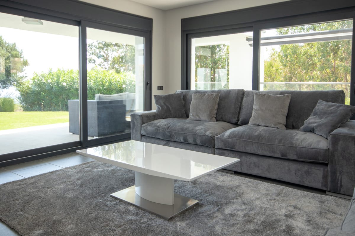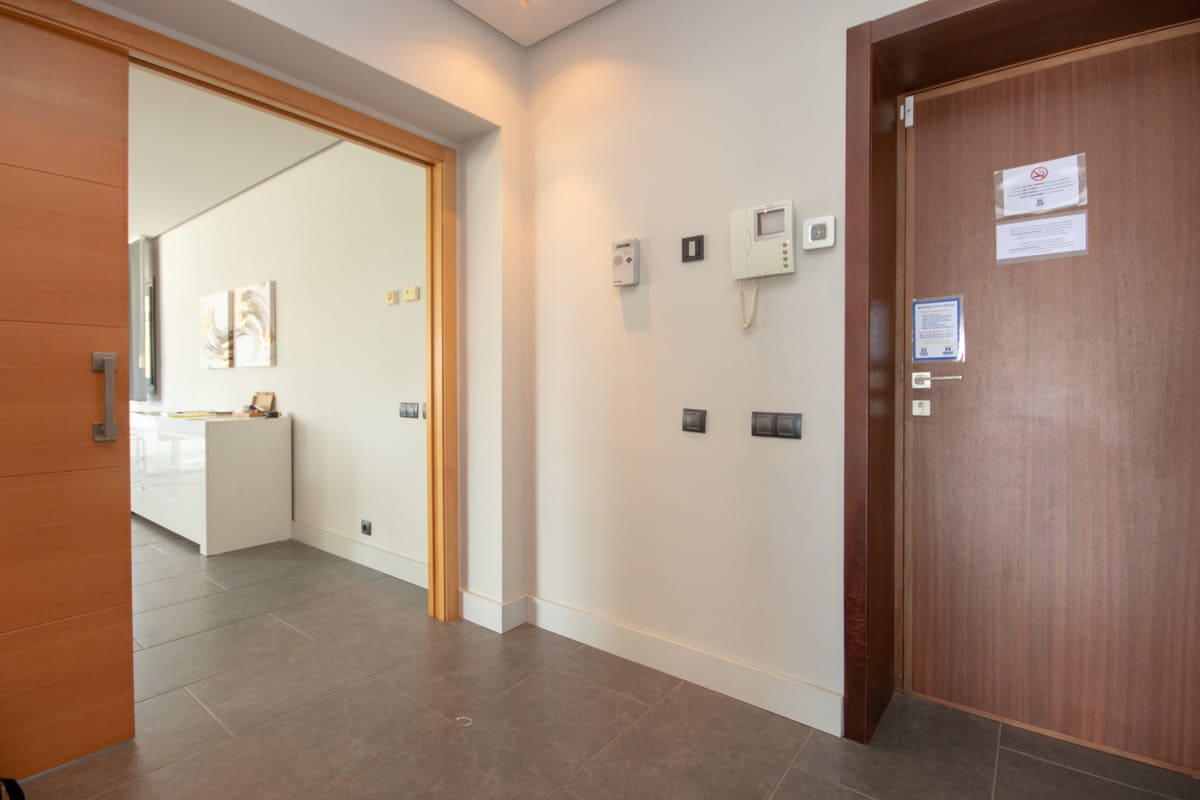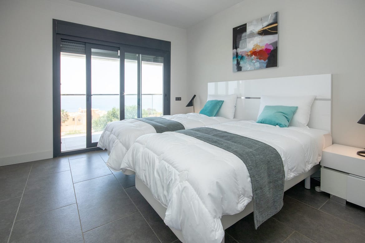 This stylish and modern villa is distributed over three levels – on the ground floor (entrance level) there is a large lounge with an offset dining area. The lounge is furnished with a large L shaped sofa, 44" TV and and fireplace. The dining area is furnished with an extending dining table with eight dining chairs. Both the lounge and dining area lead out to the beautifully manicured garden, terrace and pool area, complete with sun beds and furnished with a large dining table and chairs, lounging area and gas BBQ, all set within a mature and beautifully maintained garden with olive trees and many tropical plants. The large modern kitchen is fully equipped and also leads out onto the spacious covered terrace area . On this level is one of the spacious bedrooms fitted with a super king size bed plenty of wardrobe space, direct access to the terrace area as well as a very spacious en suite bathroom with both bath and walk in shower. Also on this floor is a guest WC. Take the stairs to the upper level and there you find three further bedrooms. The master bedroom suite is beautifully furnished with a super king size bed and offers a small sitting room area furnished with a chaise lounge and another fireplace. There is also a separate large walk in wardrobe area. Both the guest bedrooms are again very spacious, stylishly furnished with two single beds, both have extensive closet space, large en suite bathrooms and access to the upper terrace. Downstairs to the basement level there is a separate utility room and the internal access to the garage. Here you also find an underground garage with space for at least three vehicles. The villa has a full security system, vented hot and cold air conditioning throughout and all bedrooms have access to a terrace, each with incredible views. An absolute must view villa with some of the best views you will find on the southern coast of Spain!
