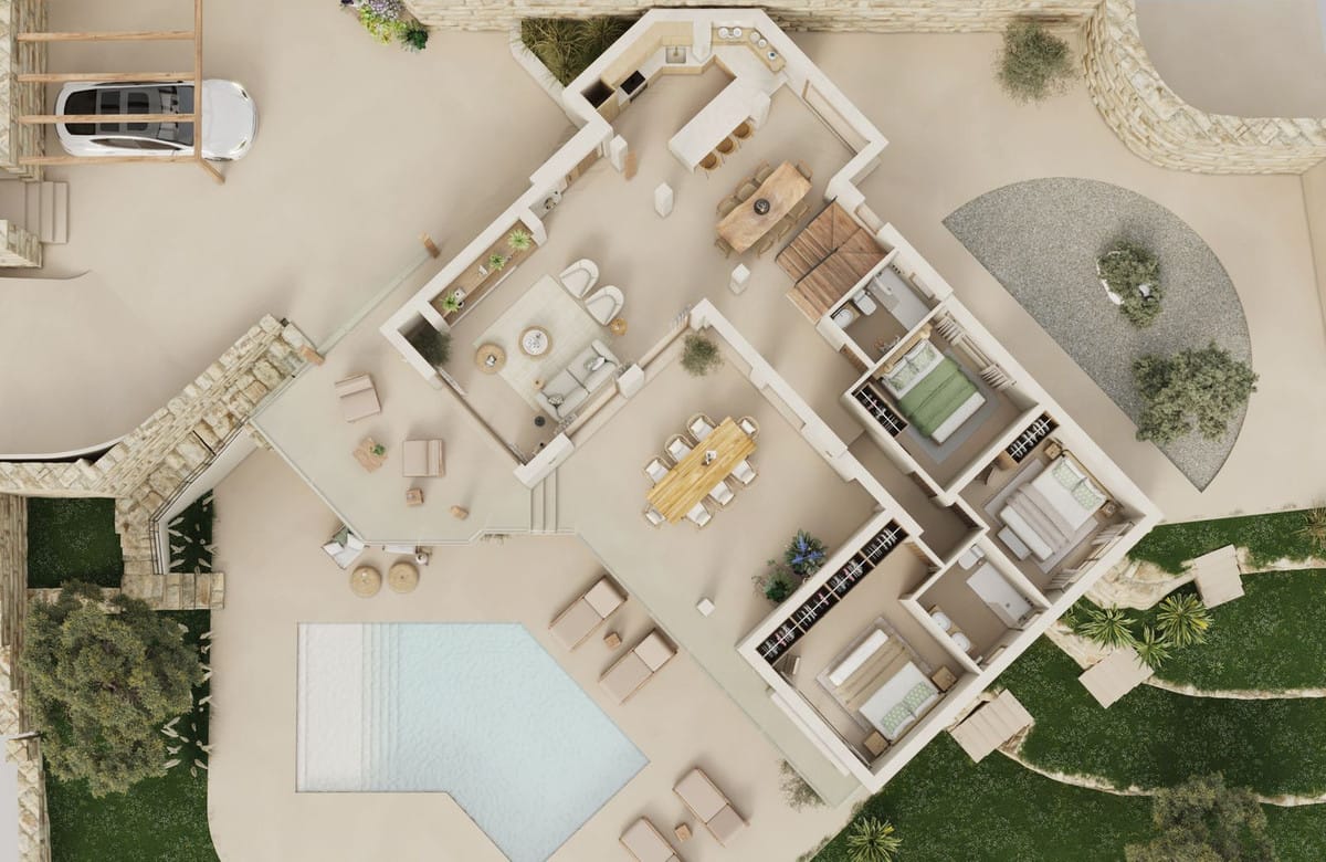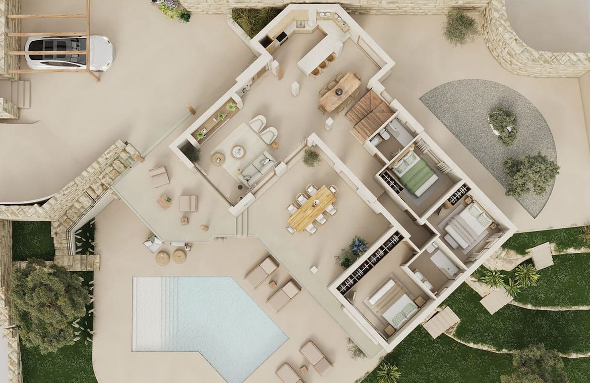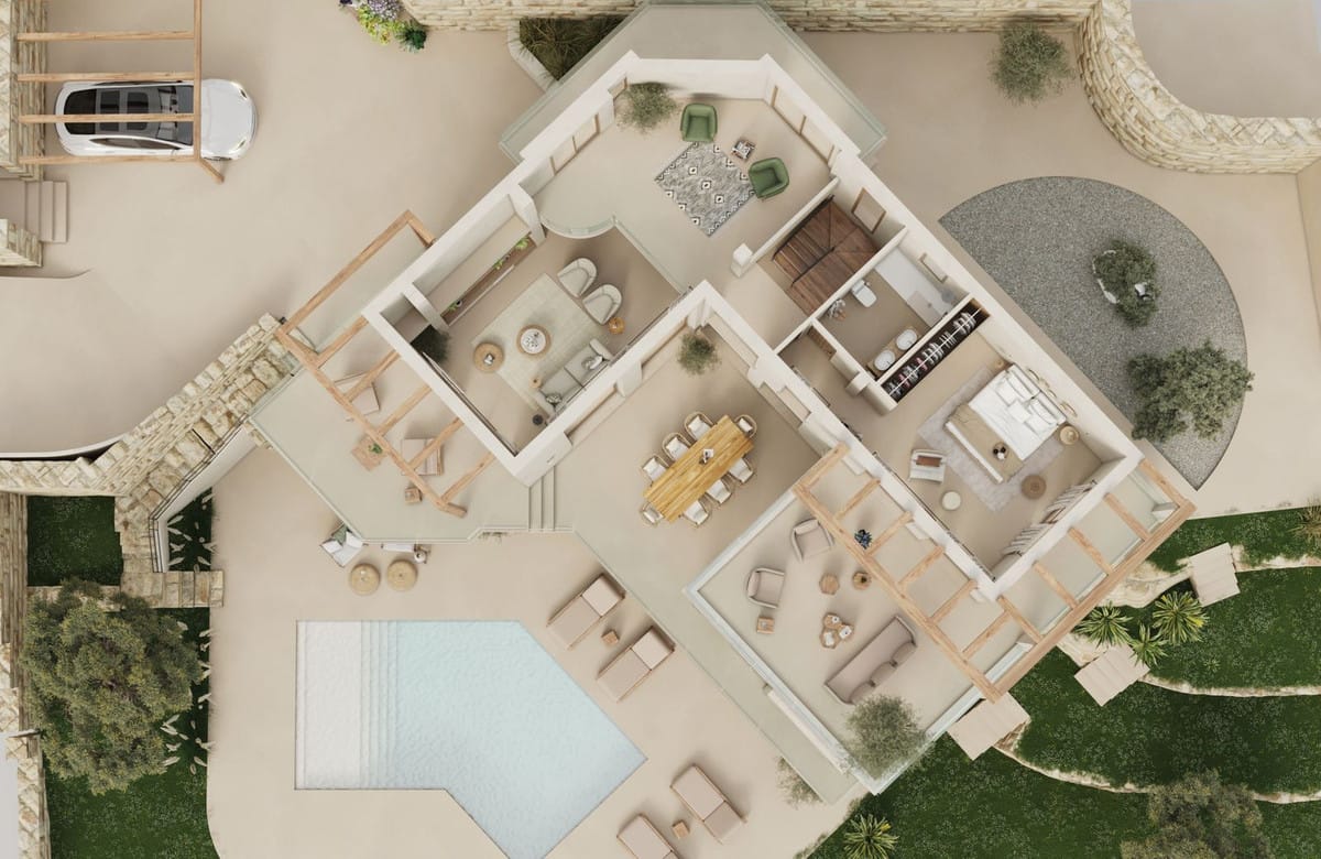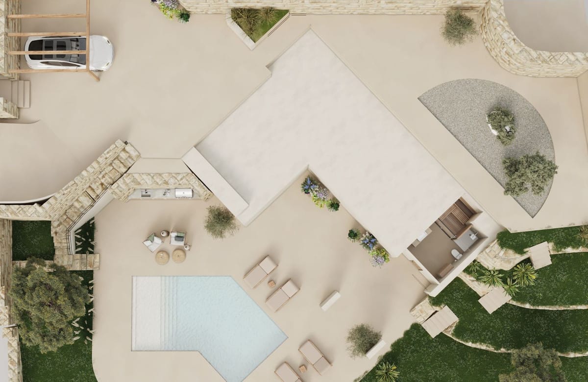 Built with noble materials such as stone, wood, and glass, this villa stands out for its elegant, contemporary design with a Mediterranean soul.