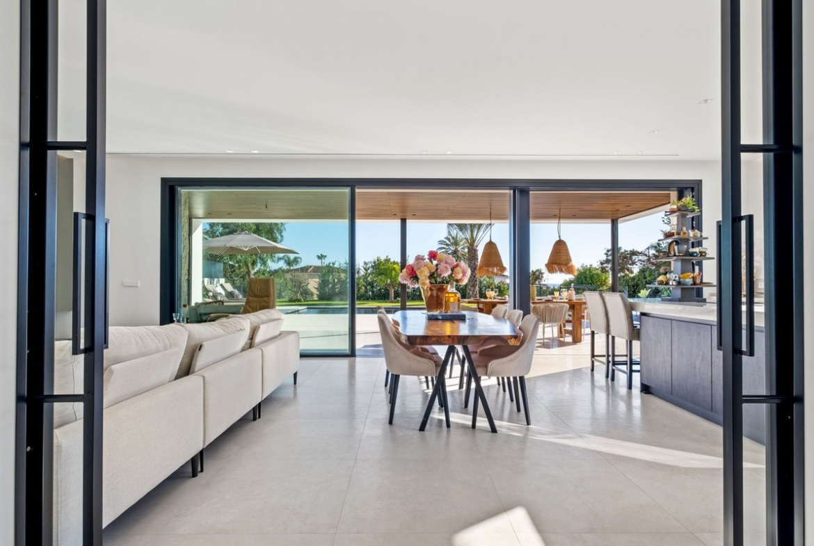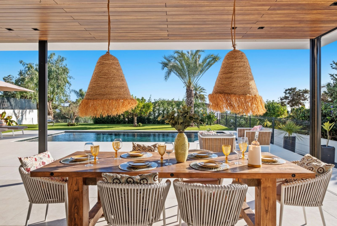 With a layout that encourages seamless flow between indoor and outdoor areas, the villa offers expansive terraces, perfect for entertaining or relaxing. The pool, with its Bali-inspired colour, becomes the visual centrepiece of the garden, designed for minimal maintenance (only €250/month for weekly upkeep garden and pool). Additionally, the property features electric awnings and automatic mosquito screens all around the covered terrace, ensuring privacy and comfort year-round.