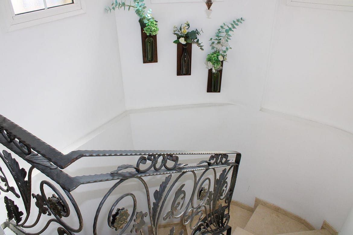 We go down the stairs with the beautifully decorated wrought iron railing, to three bedrooms and two bathrooms. One of the bedrooms has its own bathroom and there is also access to the house's natural meeting place, the large terrace with private pool. There is also a fully equipped modern kitchen, as well as a washing machine and dryer. The terrace can also be accessed from the private parking, which is located at the entrance to the house.