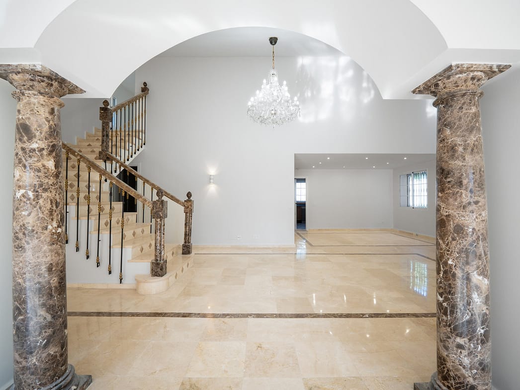 The villa is spread over two levels with three bedrooms on the ground floor and the master suite occupying the entire upper floor. Three bedrooms are ensuite and there is the option to create a fifth bedroom. The master suite includes a private terrace with beautiful views. Large windows bring natural light throughout the house and create a bright and open feel.