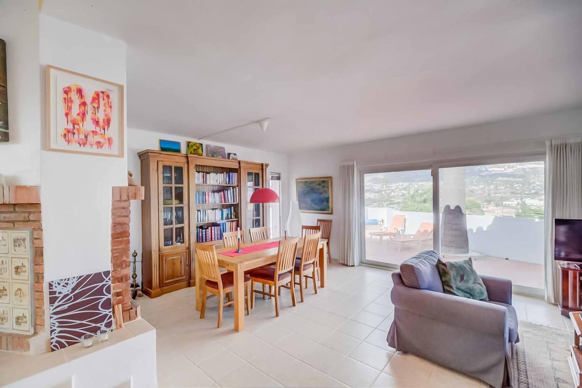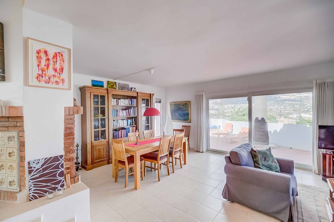 Inside, the house impresses with its large living room with a small level difference, combining a cozy reading area with desk, a seating area with fireplace, dining area, and separate kitchen, all flooded with natural light thanks to its large windows.