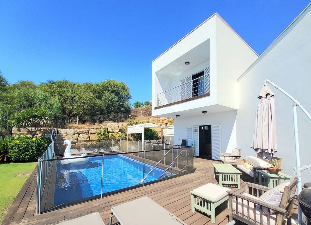 WONDERFUL CONTEMPORARY STYLE VILLA WITH GARDEN, PRIVATE POOL AND BEAUTIFUL VIEWS OF THE SEA, GIBRALTAR AND AFRICA. With a privileged location in a luxurious residential area in Torreguadiaro, JUST 5 MIN WALK FROM THE BEACH and the promenade, which will take you to the famous Port of Sotogrande, where you will find a large selection of bars, restaurants and leisure areas. Prestigious polo fields such as Ayala or golf courses such as Valderrama are 4 km away, Gibraltar airport is 10 km away and Marbella is 30 km away. This beautiful property is distributed over three floors, built with top quality materials and excellent finishes. Enjoy great light thanks to its large windows throughout the house and its SOUTH ORIENTATION. On the first floor we find the spacious living-dining room with an integrated kitchen, all in an open-plan style, very comfortable and uncluttered. On the upper floor, the rooms, of which the magnificent master bedroom with an ivory-tone marble jacuzzi bathroom. All rooms are equipped with custom wardrobes made of white lacquered wood, a minimalist and orderly feeling that achieves the entire design of the Villa.