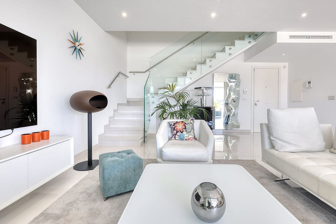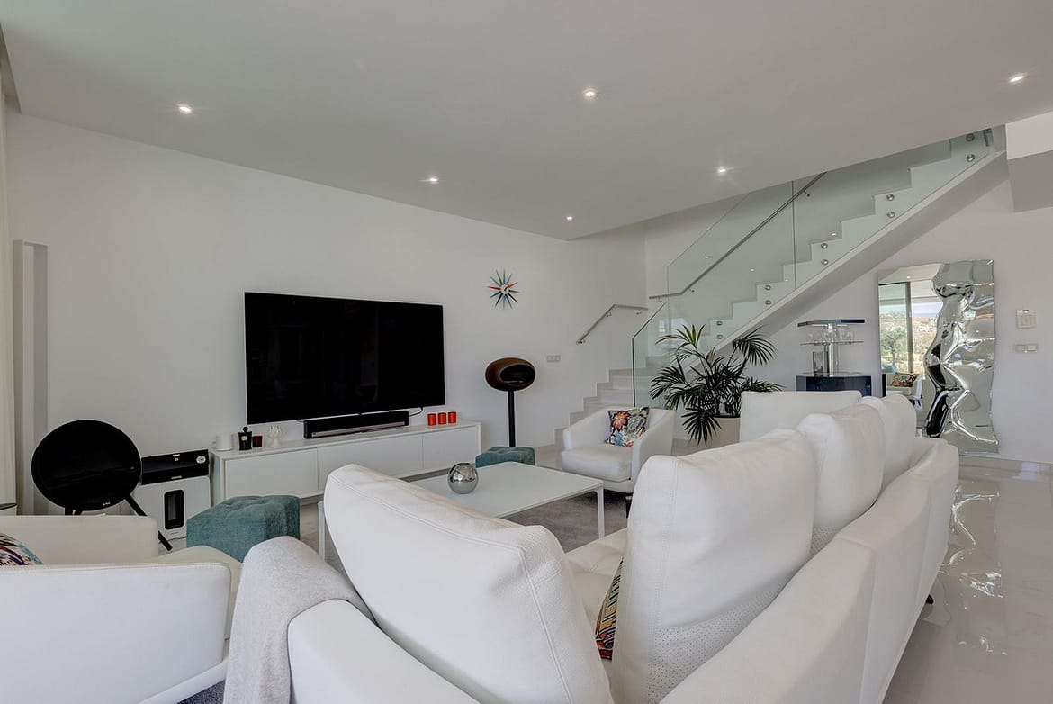 Upstairs are 3 further bedrooms, including the master with large en-suite, plenty of wardrobe space in all the bedrooms and each bedroom leads onto the top terrace offering open mountain views. The further 2 bedrooms share a large bathroom. The urbanisation is renowned for its beautiful gardens and large salt-water pool, during the winter season the indoor pool is opened so you can enjoy swimming all year round. The property also comes with 4 underground parking spaces and a large storeroom.