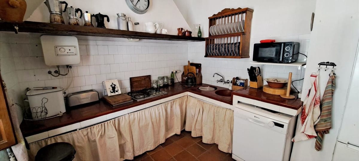 The kitchen is authentic and spacious and has all the necessary built-in appliances. A special feature is the authentic fireplace.