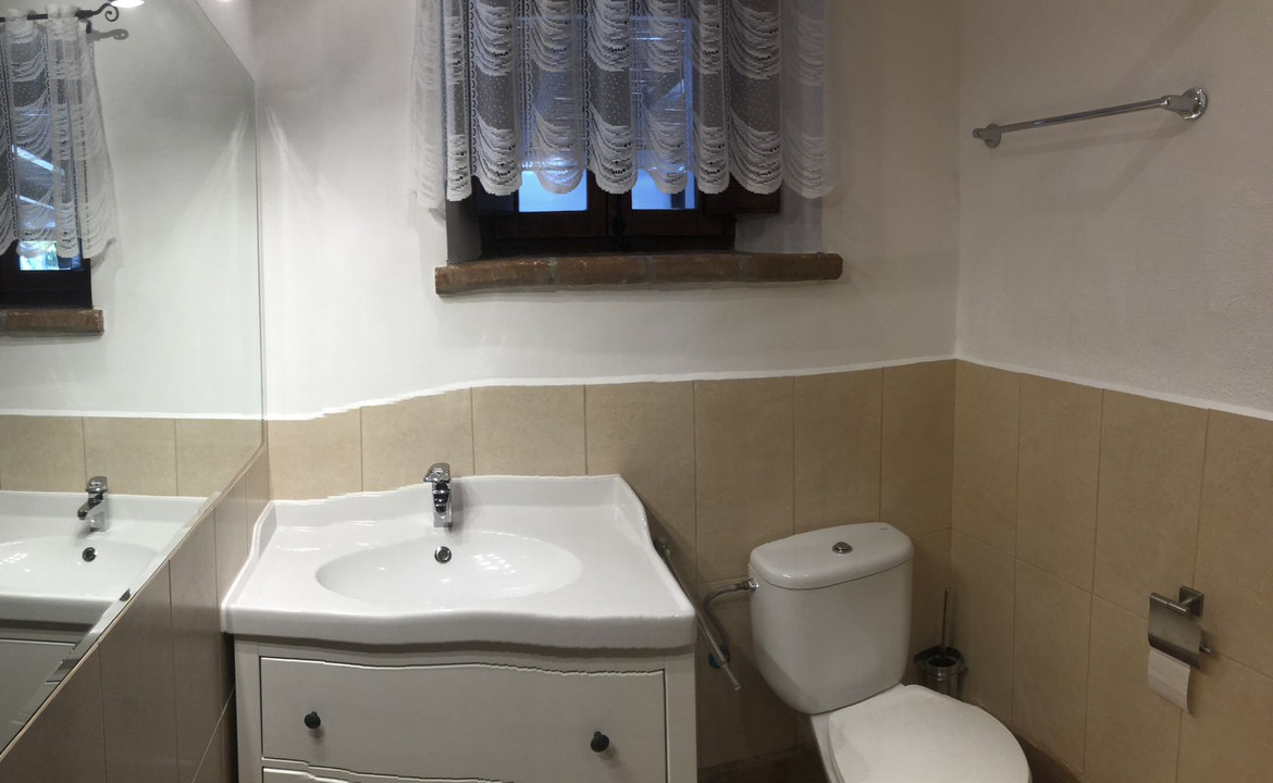 On the ground floor there are 2 bedrooms with 1 full bathroom and a shower room. Another room, which is actually used as another storage, could be opened for 1 more bedroom.
