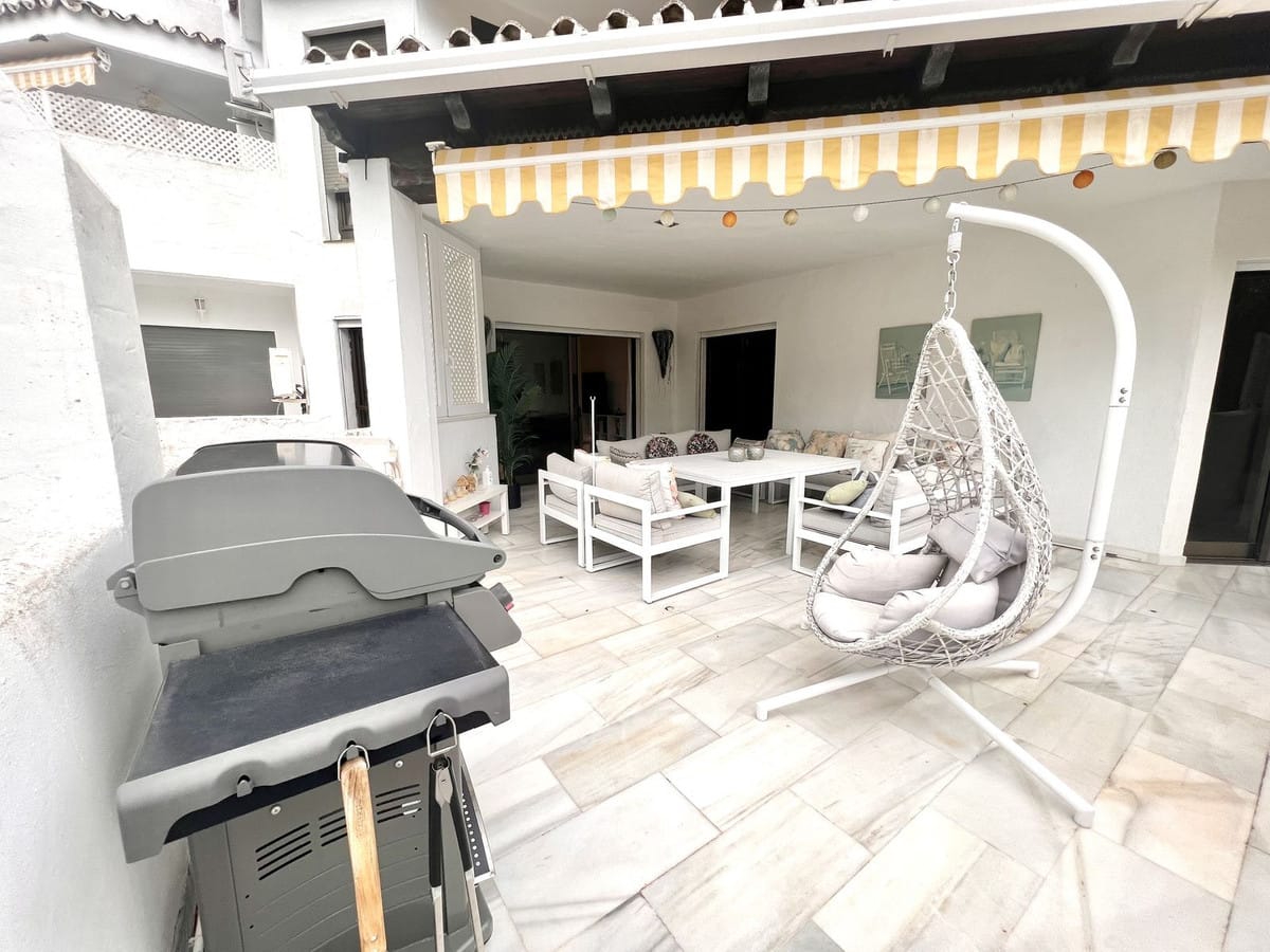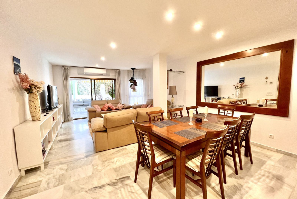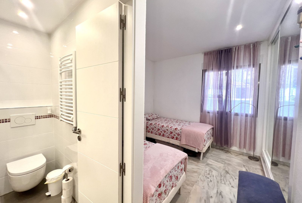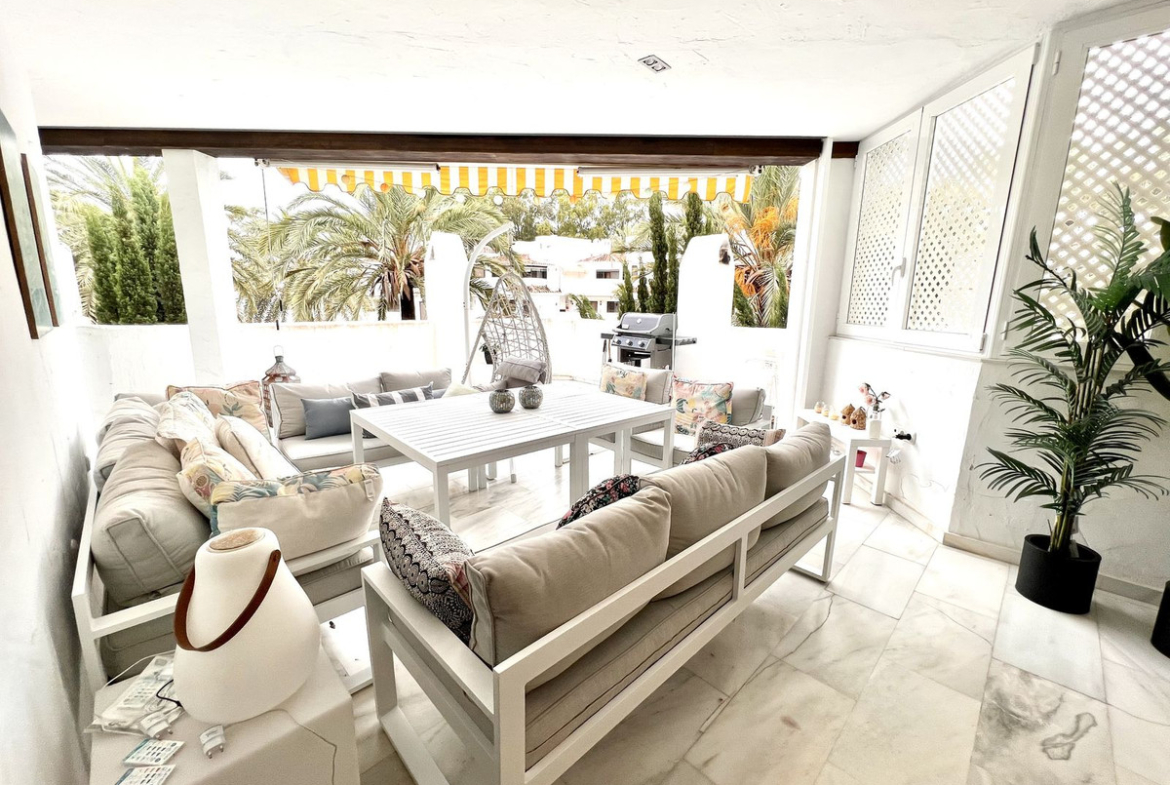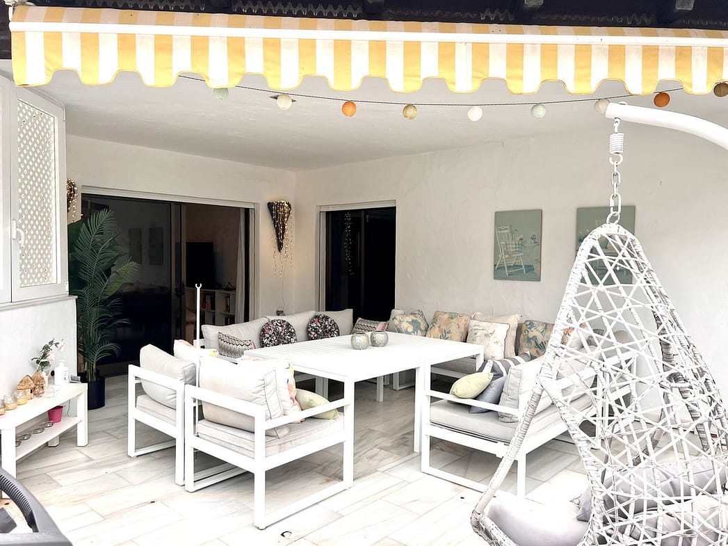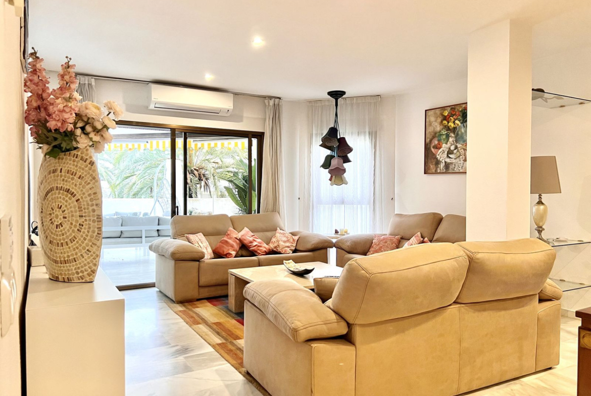 Ideal holiday acommodation for families!! Spacious 4 bedroom 4 bathroom elevated groundfloor apartment located only 1 min walk to the best beaches in Marbella. This open plan apartment is fully equipped with everything you need for a perfect holiday and it has a large terrace.