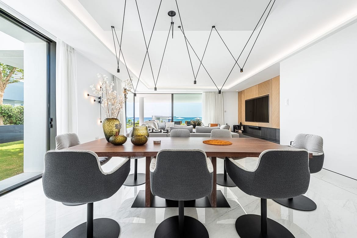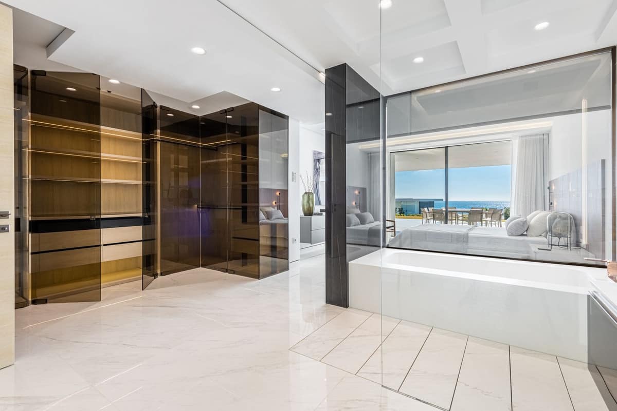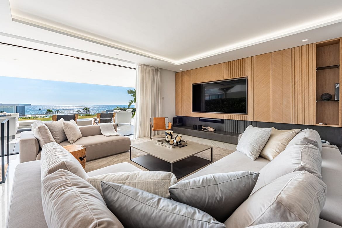 The apartment has full domotics, with hot and cold AC and underfloor heating. The compound is located in first line with direct access to the beach and the paseo and has a beautiful swimming pool, manicured gardens, concierge and 24 hr security.