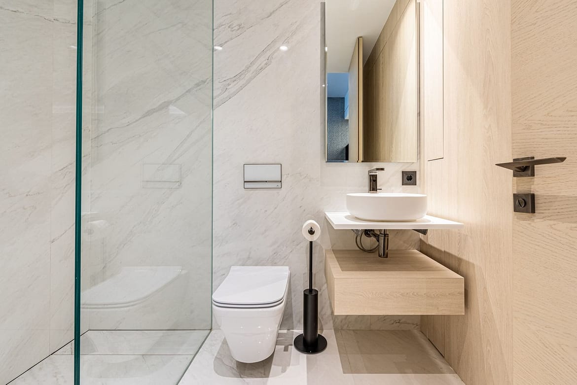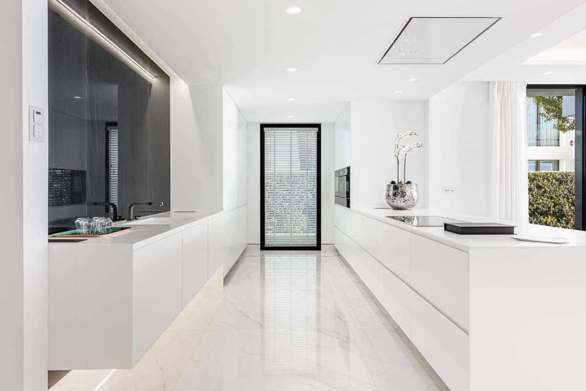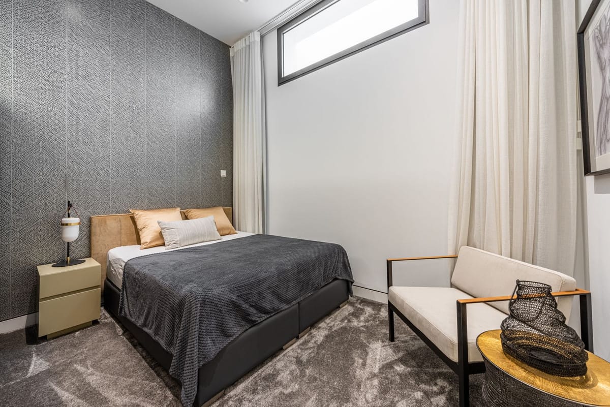 This modern and tastefully furnished apartment offers open-plan living area with beautiful views of the mediterranean sea. The american style kitchen is fully equipped with top quality appliances and the living and dining area enjoy plenty of light. From the living room we access the outside covered terrace, where we can enjoy the views, barbecue area and the direct access to the community pool and beach. On this level, we have the master bedroom with its ensuite bathroom and built-in wardrobes. On the same level, we have two full bedrooms with their en-suite bathrooms as well as guest toilet. The elevator takes us one level down where we find a fourth bedroom as well as the garage.