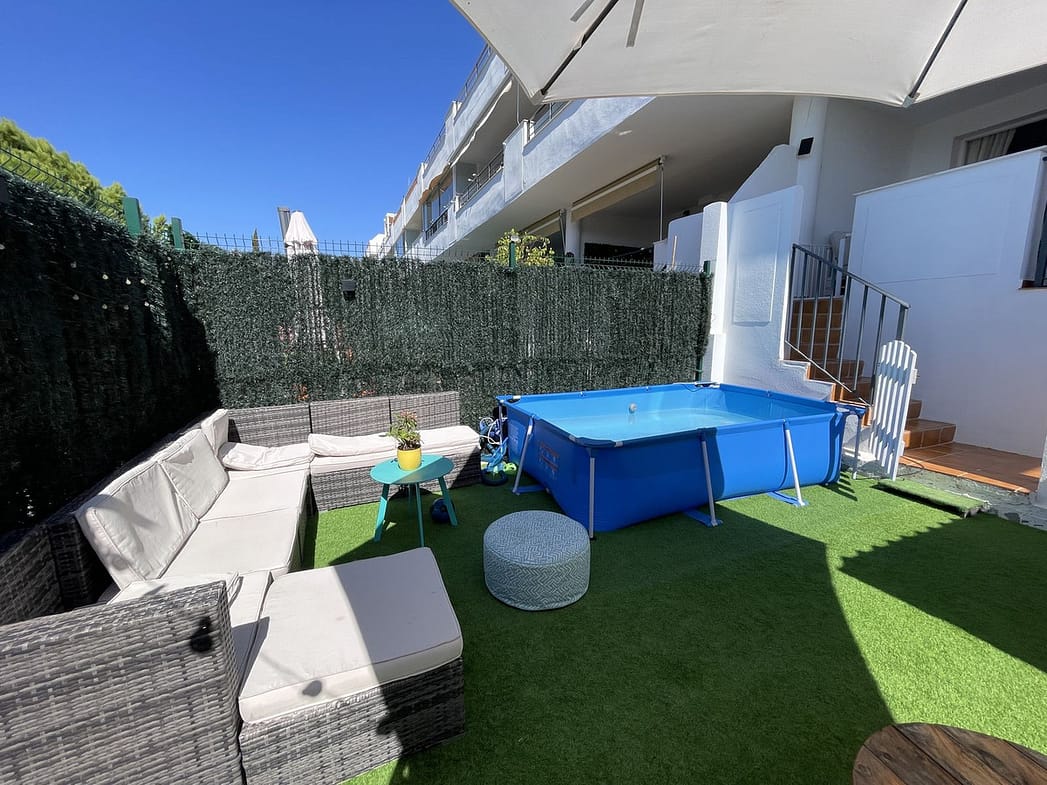 Fully renovated front patio of more than 30 m², finished with concrete flooring and low-maintenance artificial grass. A pergola with integrated gas barbecue makes it the ideal setting for gatherings with friends and family.