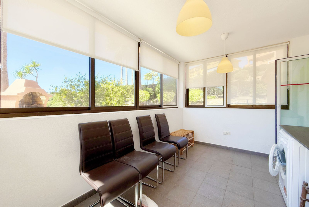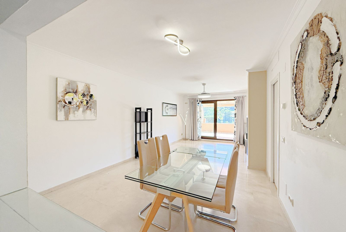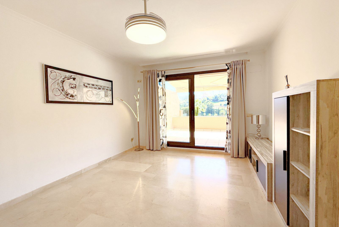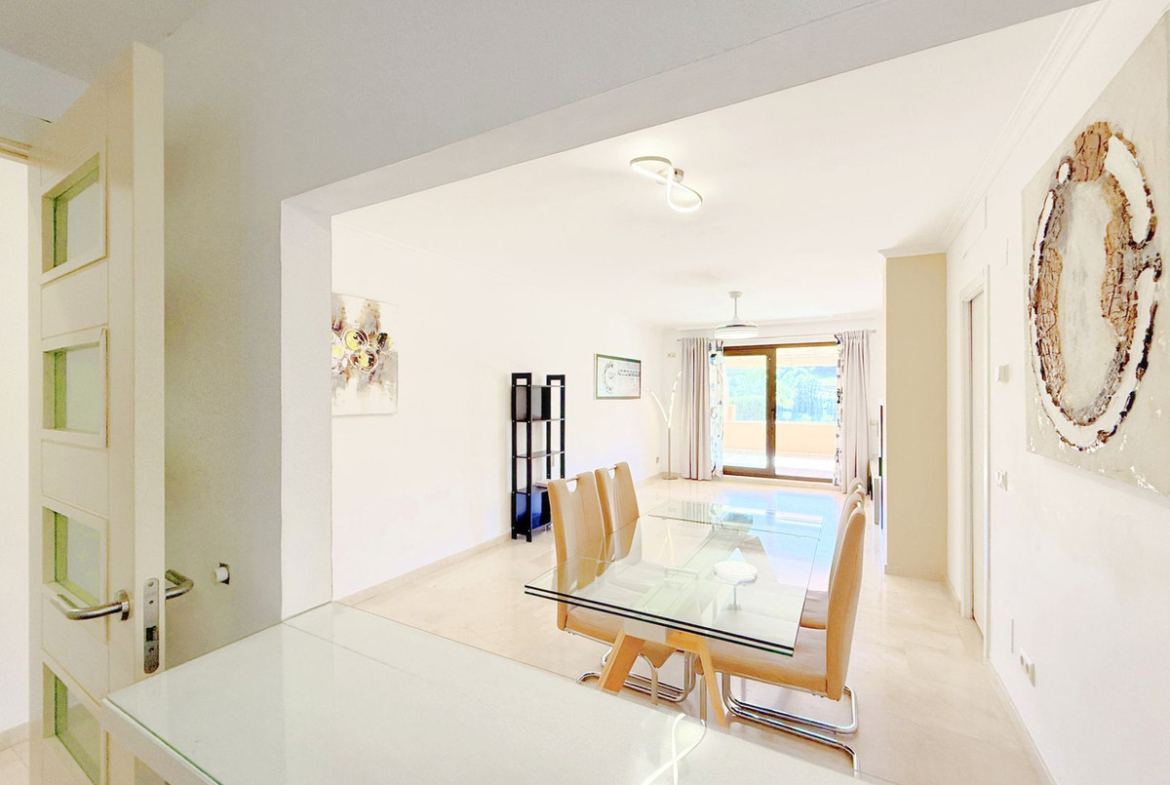 The property, all on one level, is spacious, bright, and extremely comfortable. It features four bedrooms and two bathrooms, a large living room with direct access to the terrace and private garden, from where you can enjoy spectacular views of the golf course and the sea. Thanks to its elevated position, the apartment offers a sense of privacy and tranquility, allowing for a peaceful living experience surrounded by nature.