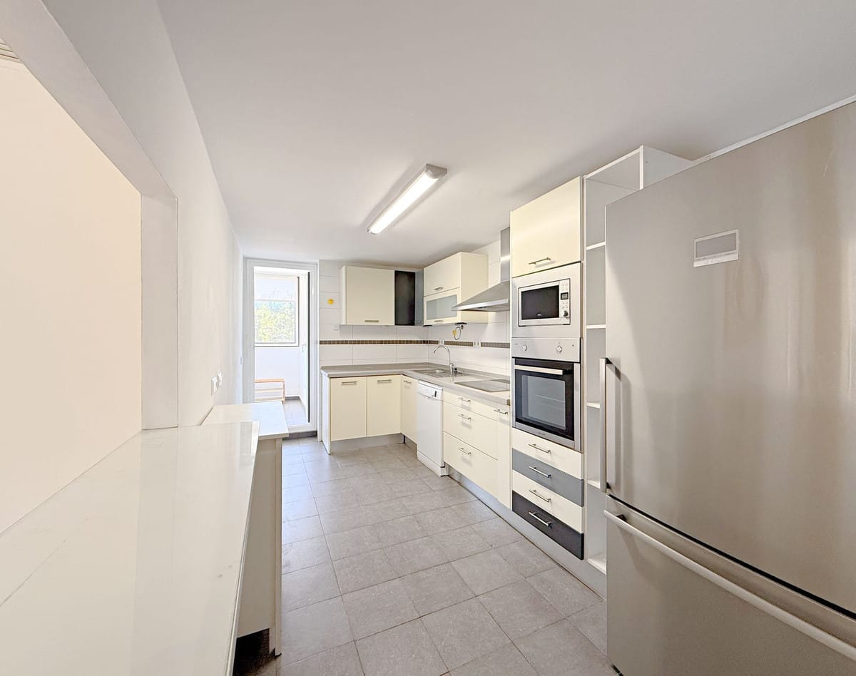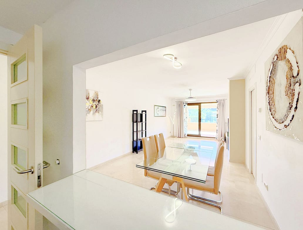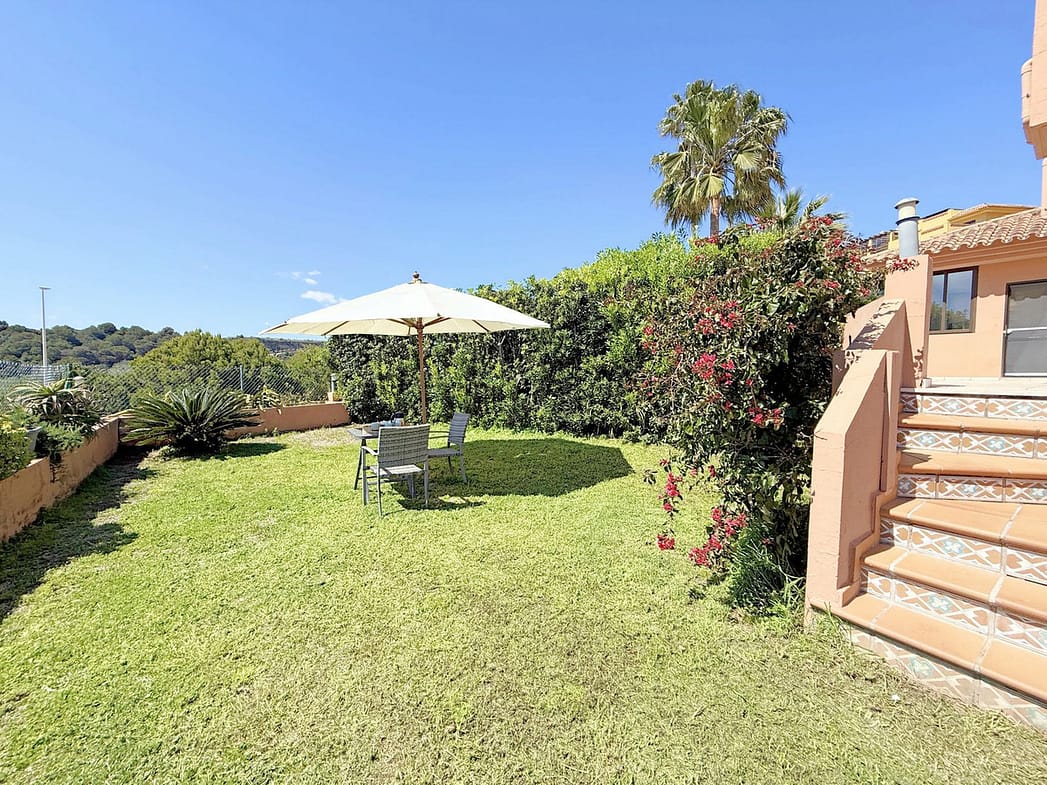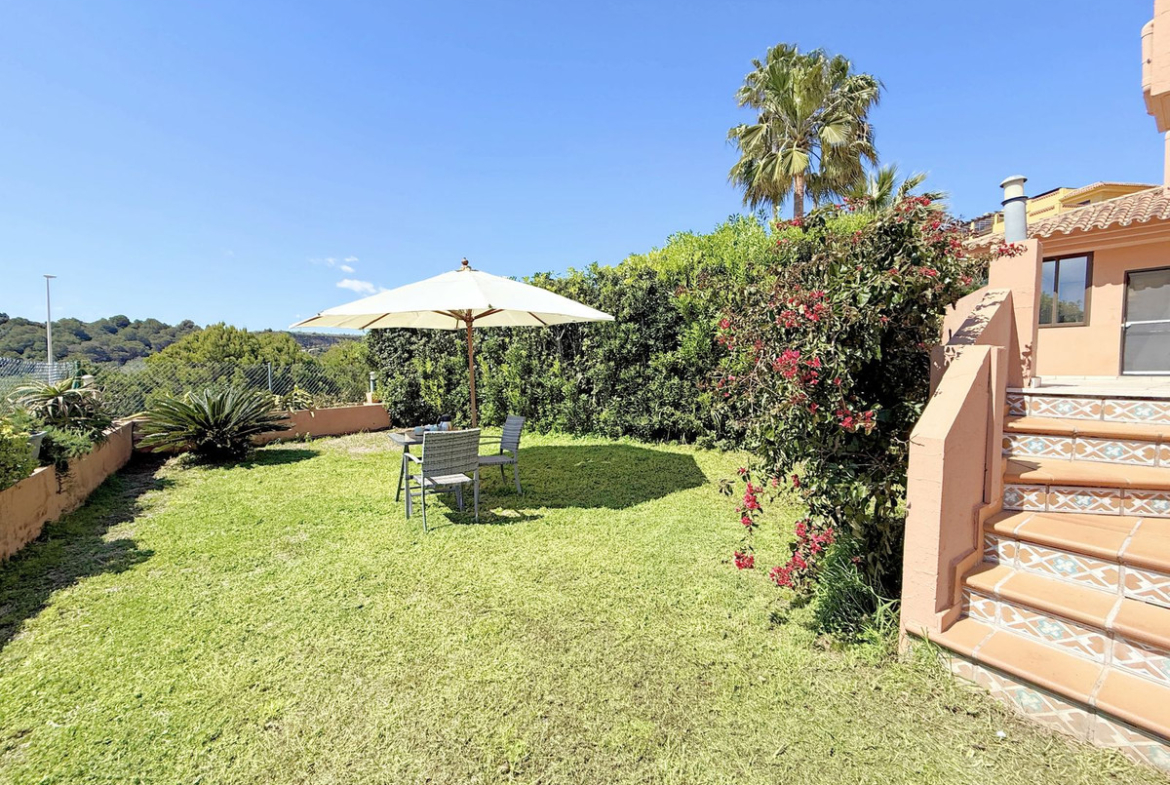 The property, all on one level, is spacious, bright, and extremely comfortable. It features four bedrooms and two bathrooms, a large living room with direct access to the terrace and private garden, from where you can enjoy spectacular views of the golf course and the sea. Thanks to its elevated position, the apartment offers a sense of privacy and tranquility, allowing for a peaceful living experience surrounded by nature.