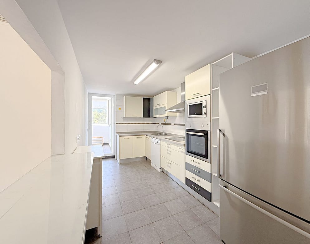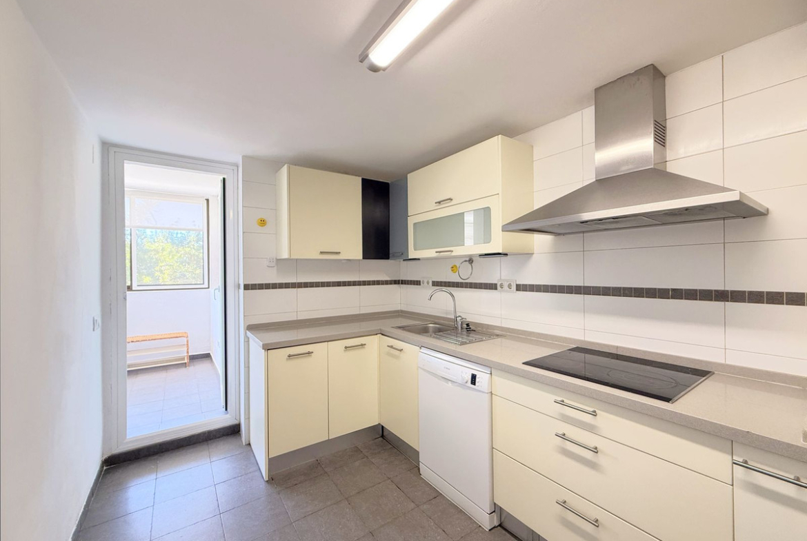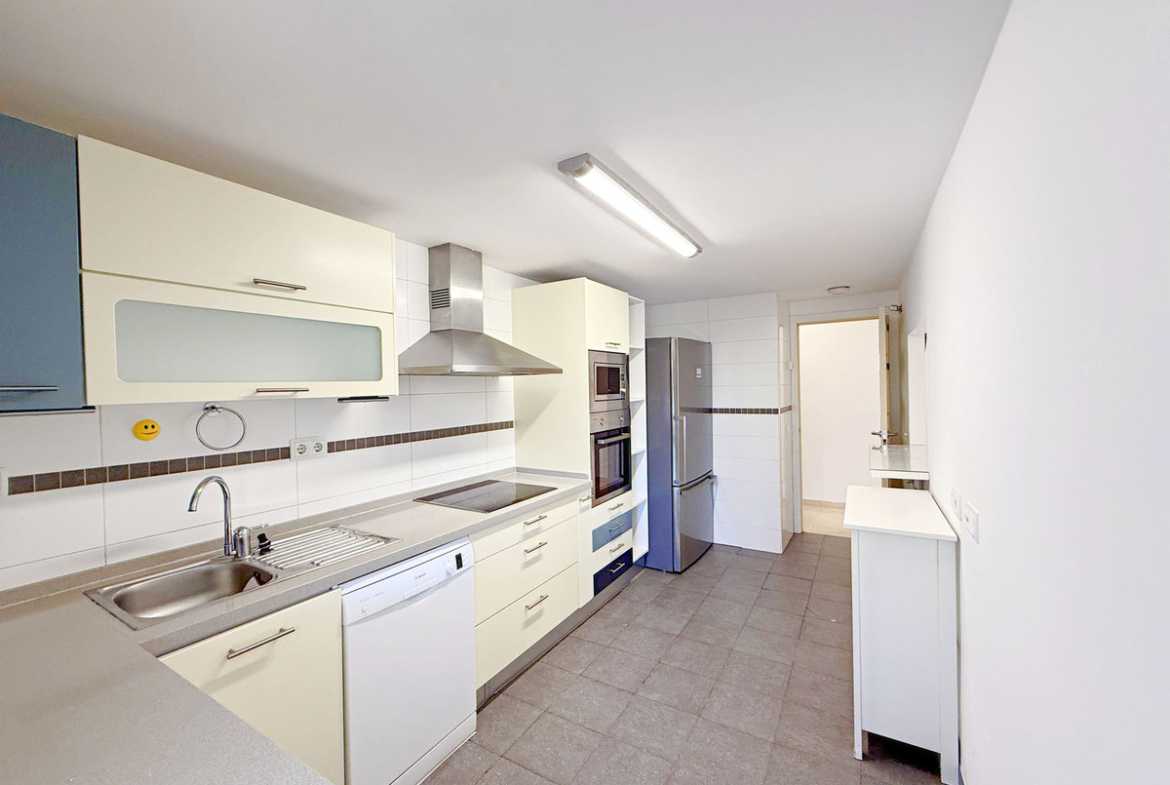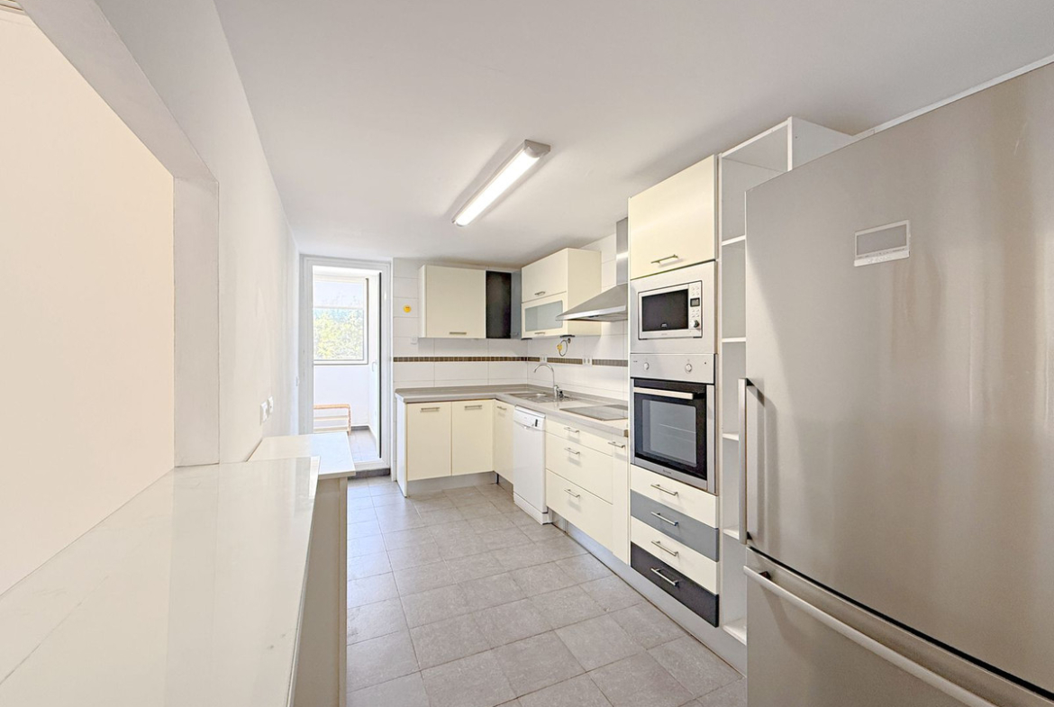 Built with high-quality materials, the apartment comes with a fully equipped kitchen. It is part of a well-maintained community with landscaped areas and a communal swimming pool. Additionally, it offers a spacious private and secure parking space, providing extra convenience and security.