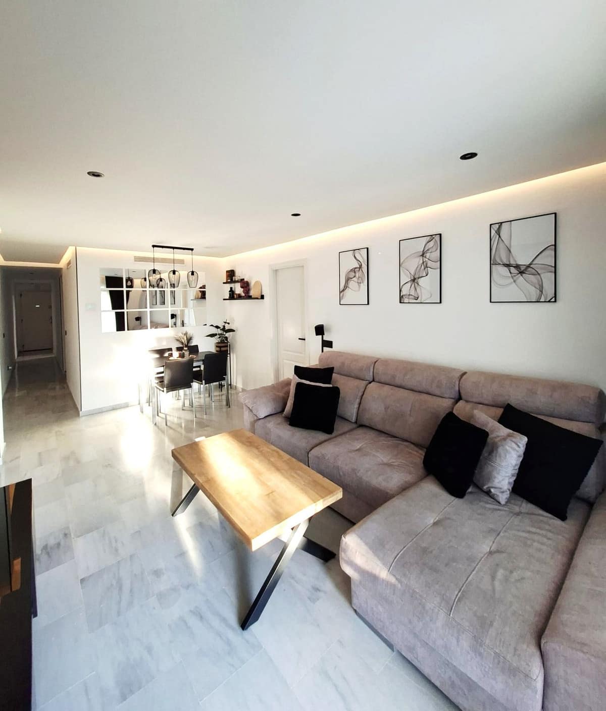 Combination of marble and wooden flooring, offering elegance and warmth