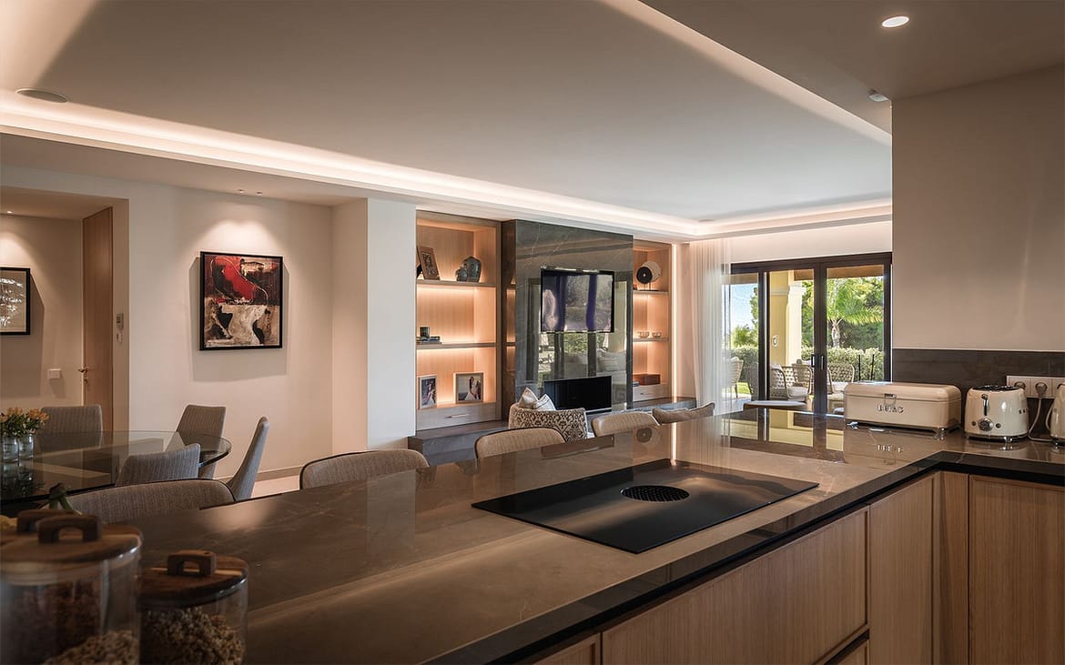 Every detail has been curated for exceptional comfort, including large-format ceramic flooring, fireplace, underfloor heating throughout, Airzone-controlled climate system in every room, full Domotics and built-in Sonos sound system throughout, and an impressive chef’s kitchen with Teppanyaki-style grill and Miele appliances.