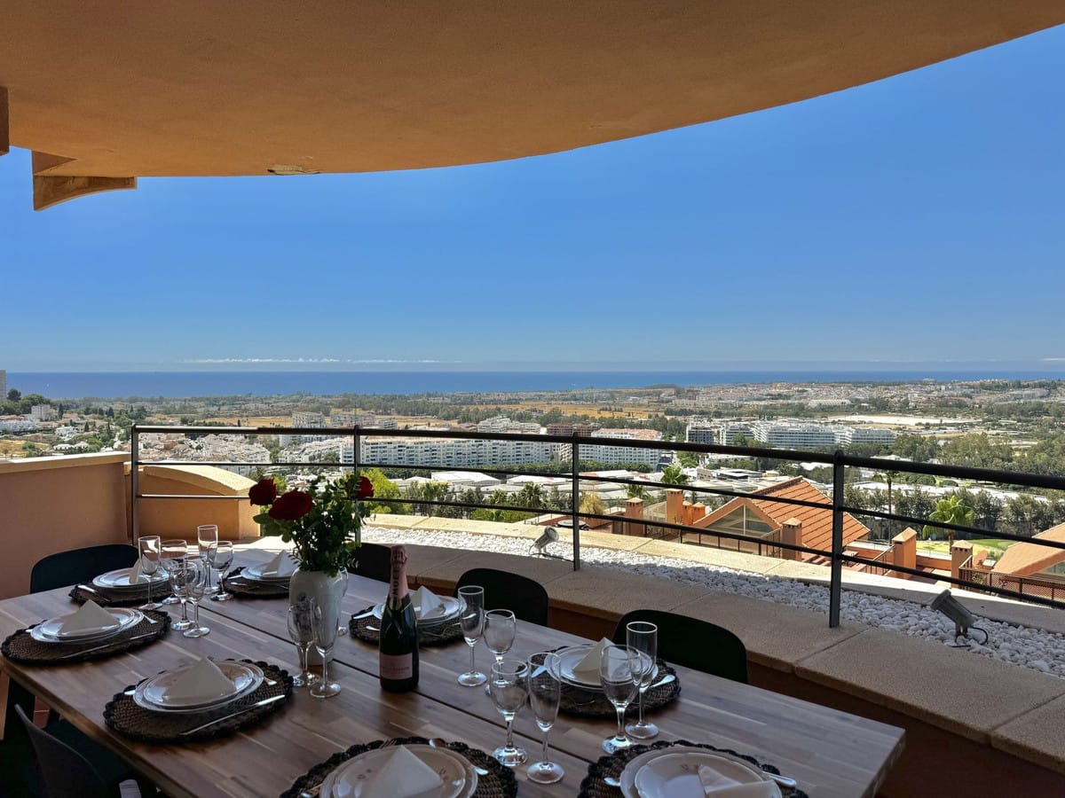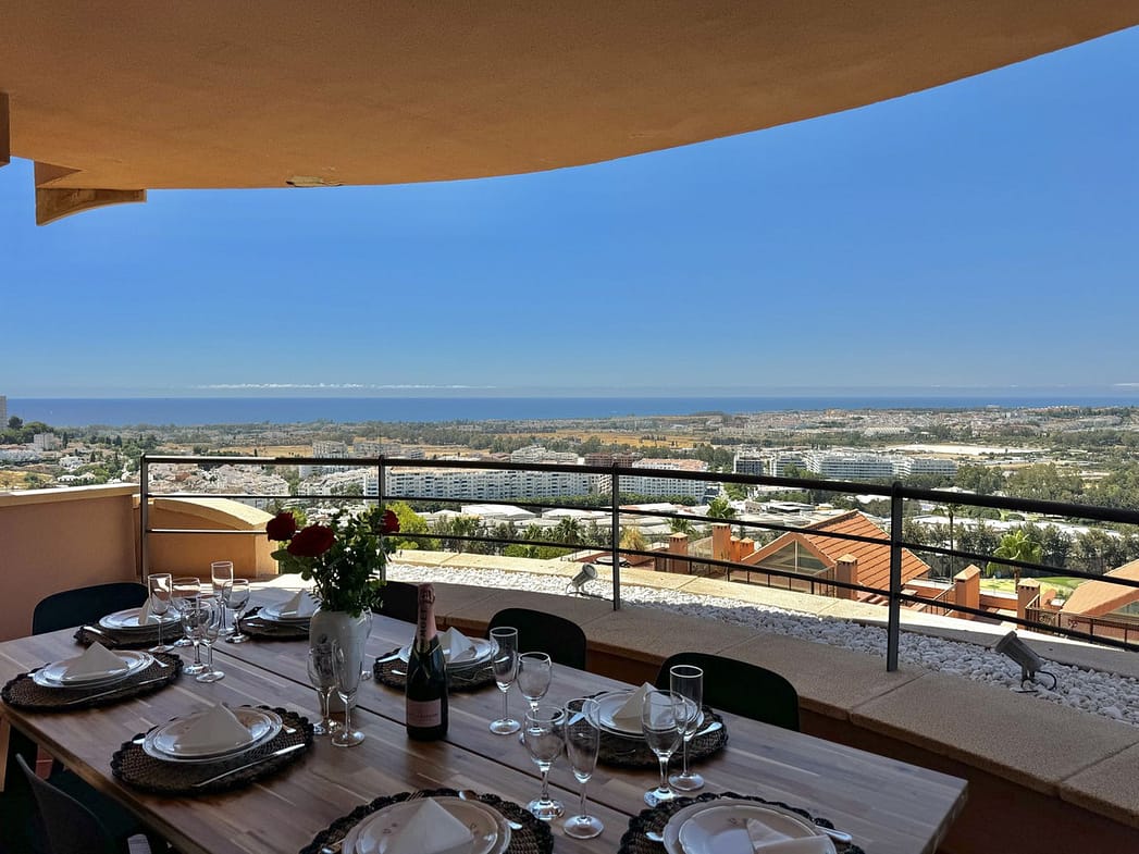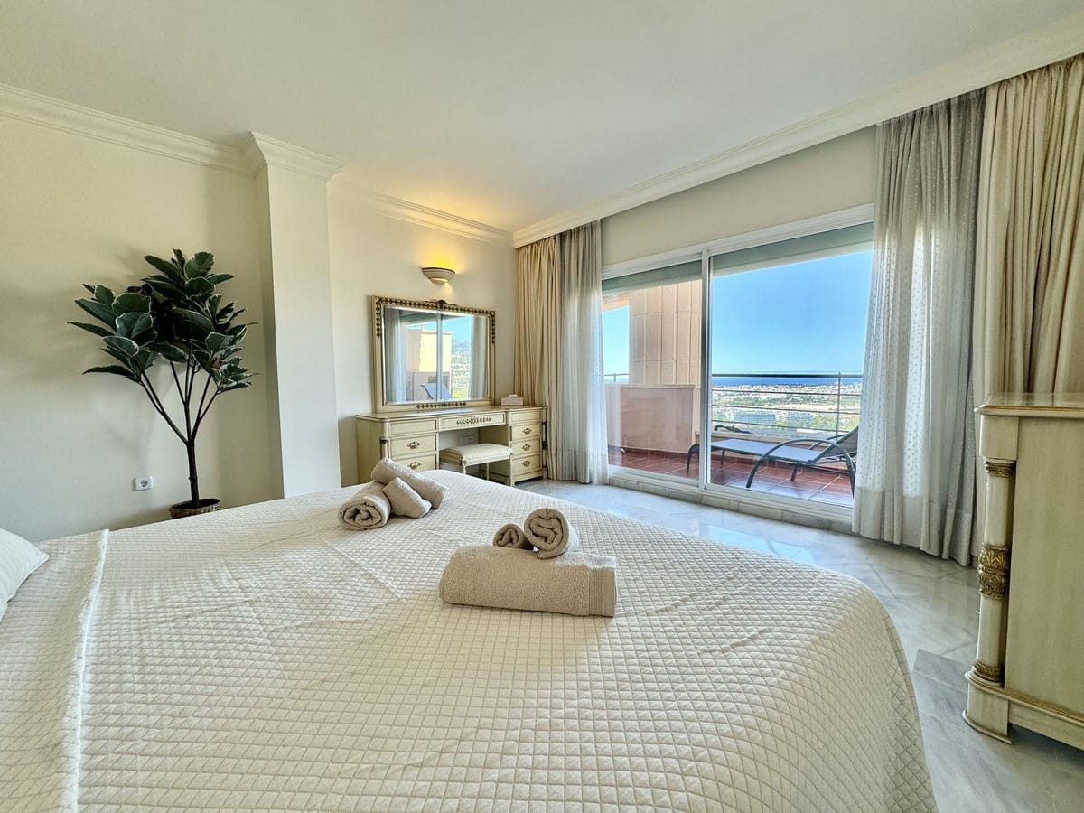 It is one of the largest properties in the complex, facing west and offering beautiful 180º panoramic views to the sea, mountains and golf. This property has four large bedrooms and 2 full bathrooms. A spacious living room, fully furnished kitchen equipped with everything you need for a dream holiday. The living room gives access to a cozy and spacious terrace, which invites you to enjoy the incredible panoramic views and magnificent sunsets.
