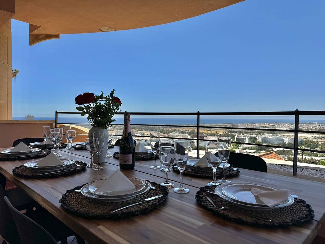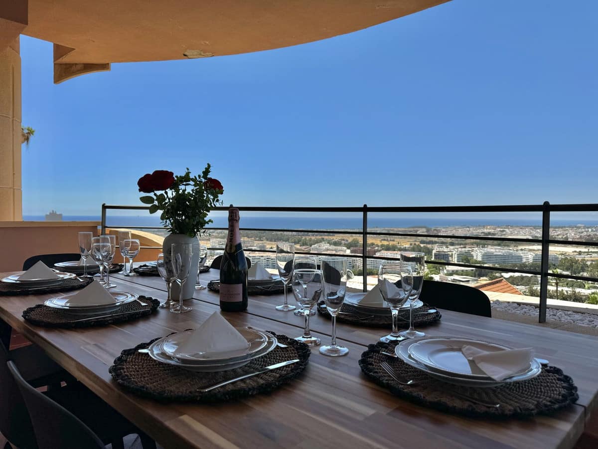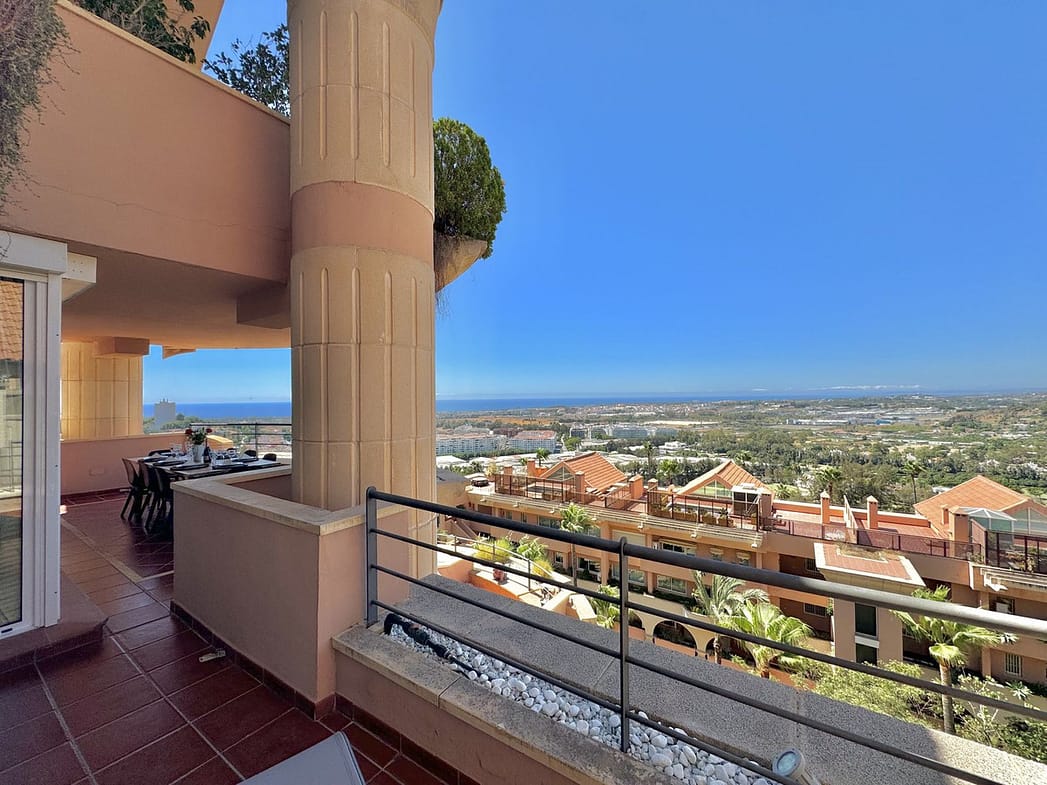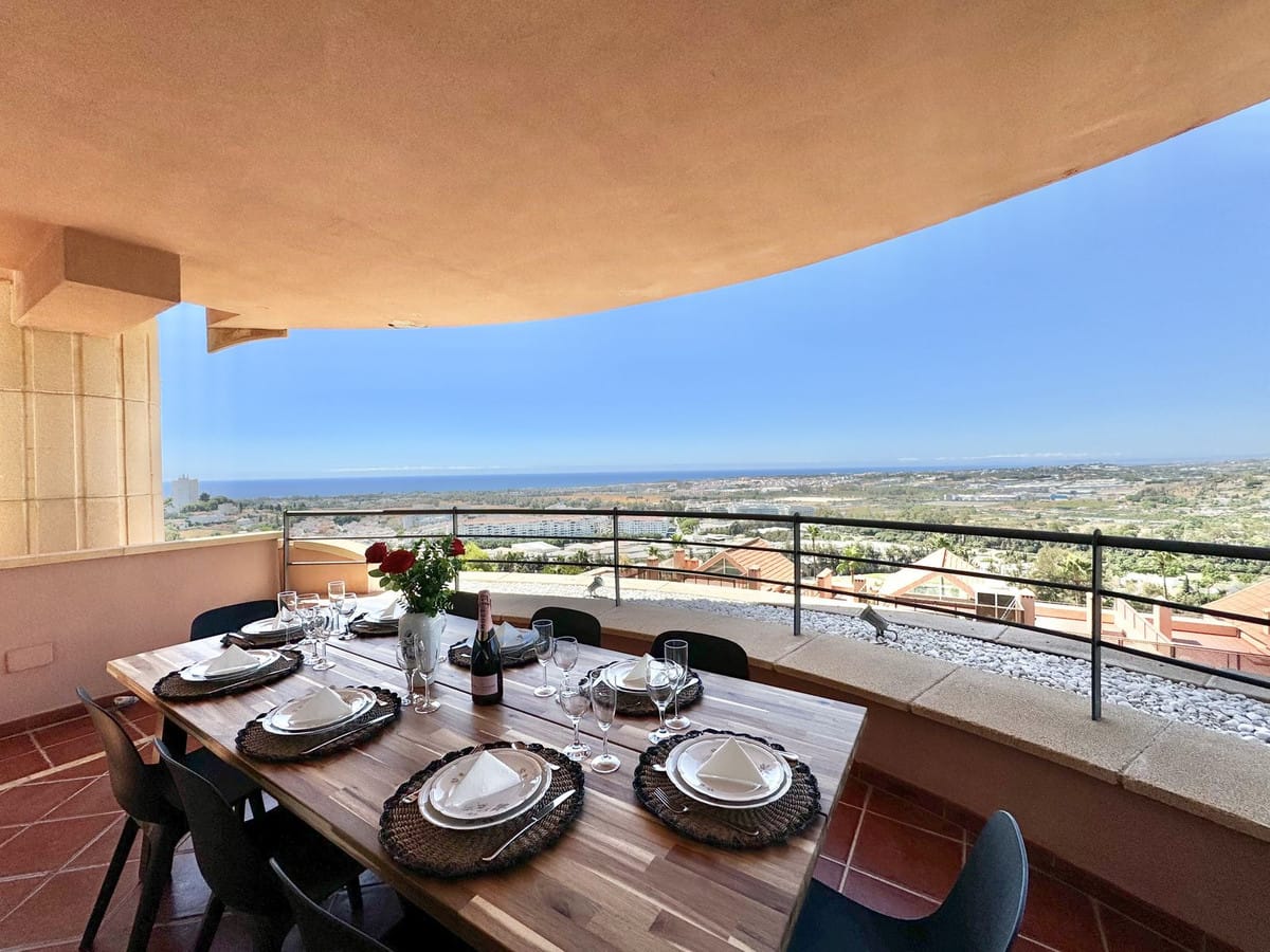 It is one of the largest properties in the complex, facing west and offering beautiful 180º panoramic views to the sea, mountains and golf. This property has four large bedrooms and 2 full bathrooms. A spacious living room, fully furnished kitchen equipped with everything you need for a dream holiday. The living room gives access to a cozy and spacious terrace, which invites you to enjoy the incredible panoramic views and magnificent sunsets.