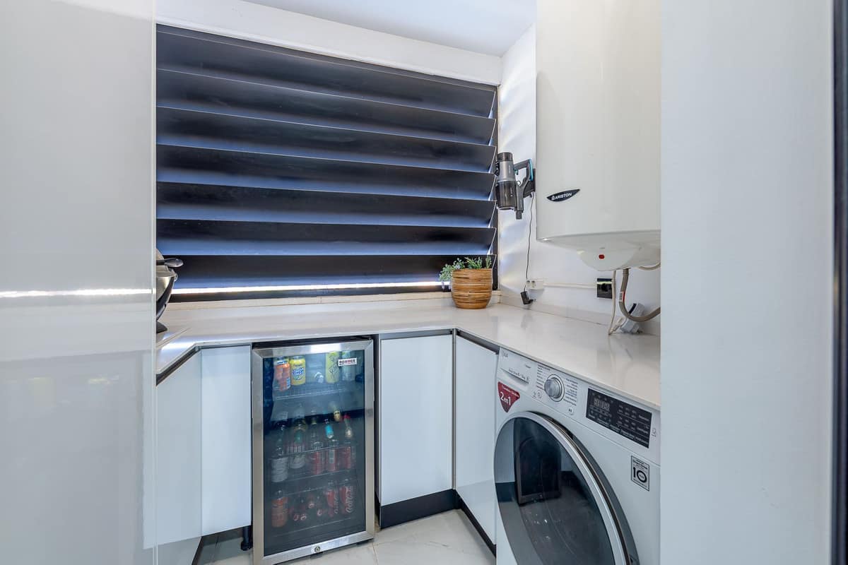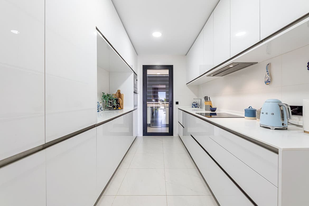 The bright and airy living/dining area opens onto a beautiful terrace with dining and lounge spaces, perfect for enjoying panoramic sea and mountain views. On clear days, you can even admire the spectacular silhouettes of Gibraltar and North Africa. With sunshine all day long, it’s ideal for year-round living: enjoy sunrises over Estepona town and unforgettable sunsets over the mountains.