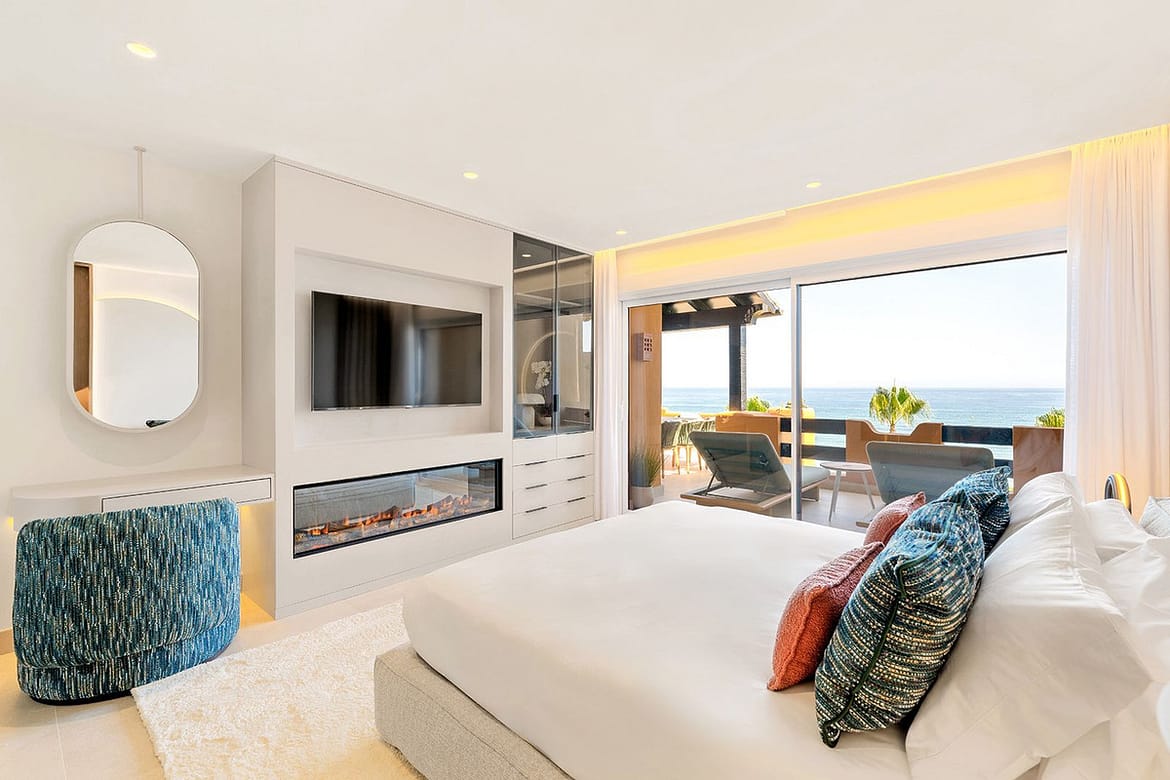 This fully remodelled 4 bedroom and 4 bathroom apartment is an amazing opportunity for people who are looking for luxury and comfort in a stunning beachfront location. The spacious living and dining room and the luxurious master bedroom with its en-suite bathroom and walk-in wardrobe both have direct access to the impressive south facing terrace with panoramic sea views. Los Granados del Mar is one of the most exclusive urbanizations on the New Golden Mile with breathtaking views of the Mediterranean Sea. Its combination of beautifully maintained gardens and luxurious facilities such as an on-site restaurant, a heated indoor pool, 2 outdoor pools, a gym, a sauna, a Jacuzzi and 24h security make this community one of a kind. It has direct beach access and is very close to all amenities, shops, schools, high class restaurants, the newly build Laguna complex and the center of Estepona. This bright 187 m² apartment boasts a brand-new open-concept designer kitchen with premium German appliances and luxurious extras, including a Bang & Olufsen sound system, an electric fireplace, and a freestanding bathtub. Underground parking with direct lift access to the apartment as well as a secure storage room are included in the price.