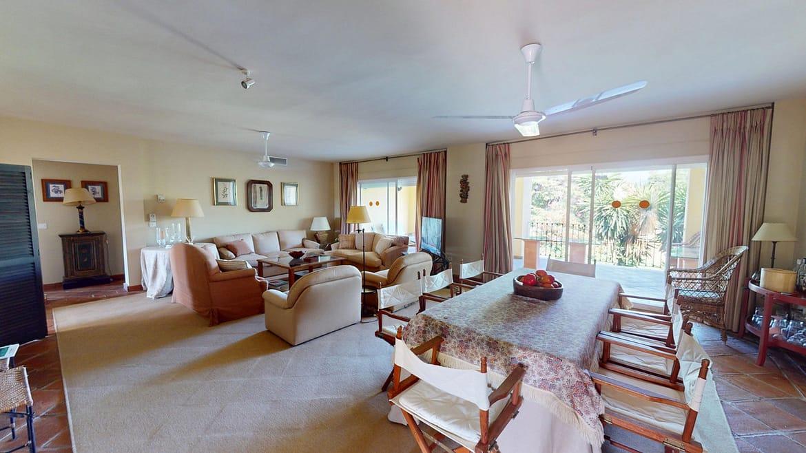 This elegant apartment, created by combining two properties, offers a unique space on a single floor with 4 spacious bedrooms and 4 bathrooms, two of which are en-suite. The layout features two separate entrances: one with direct access to the kitchen and the other leading to a bright entrance hall, from which you can access a large living room connected to a spacious covered terrace, ideal for enjoying the relaxing views of the golf course.