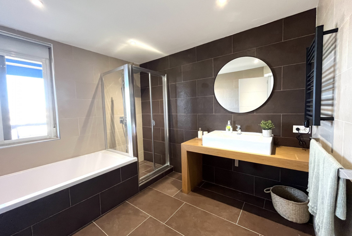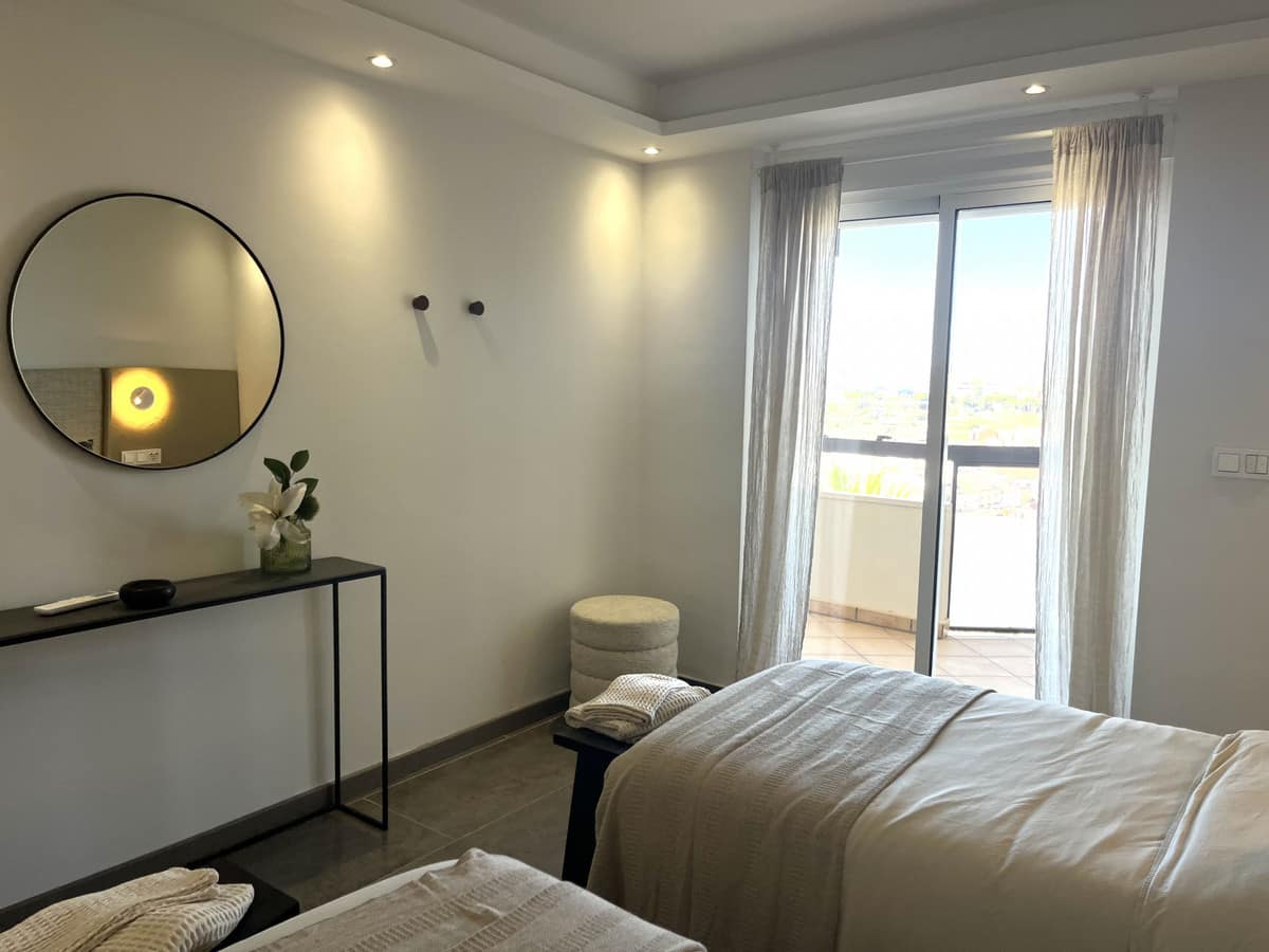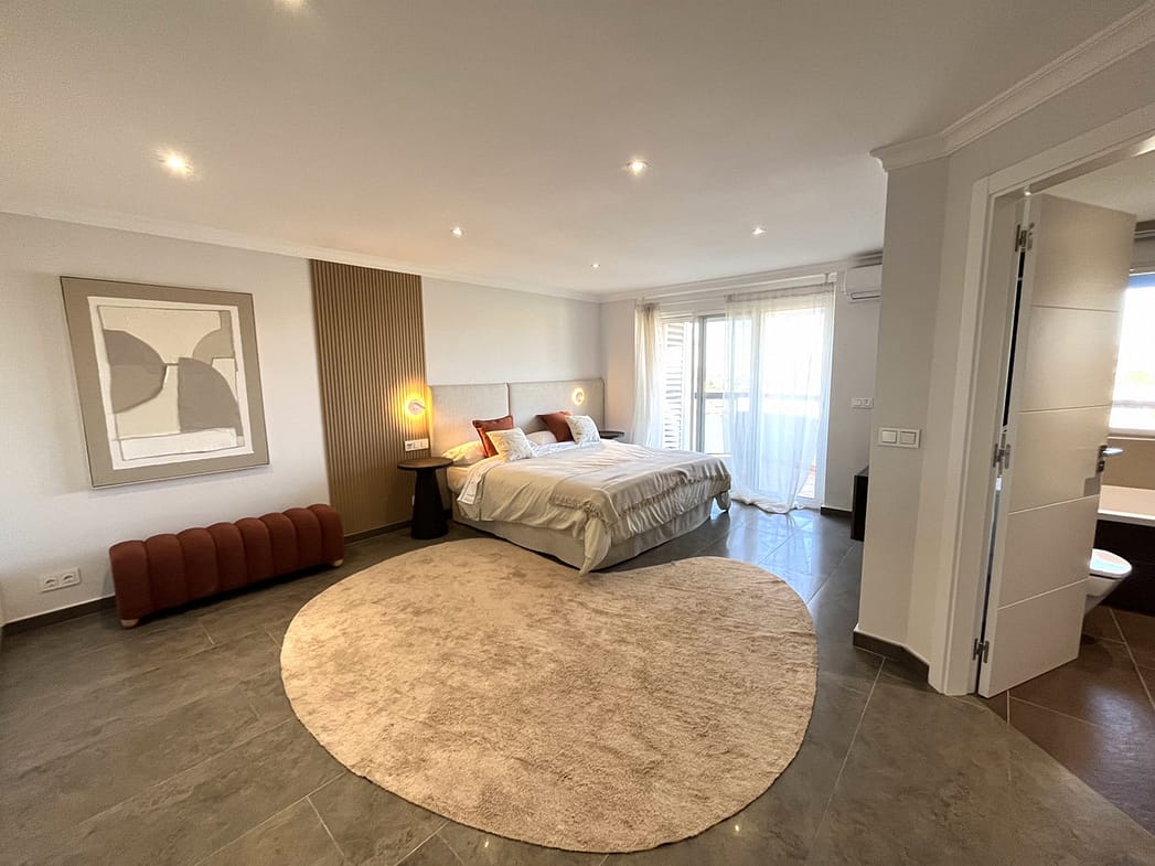 The master bedroom is exceptionally spacious and features its own en-suite bathroom, creating a private retreat within the home. Two of the bedrooms, as well as the living area, offer direct access to the expansive terrace, where you can enjoy breathtaking views that can also be admired from inside the apartment through large windows that flood the space with natural light.