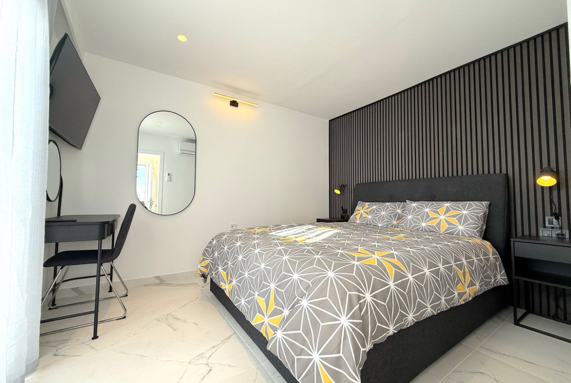 In a separate building on the terrace, discover a charming single bedroom. It’s the perfect hideaway for the night owl in your group or a peaceful sanctuary for afternoon naps. The roof terrace is the crown jewel of this penthouse, featuring sunbeds, a BBQ, and a dining table for alfresco feasts with a side of sea breeze.