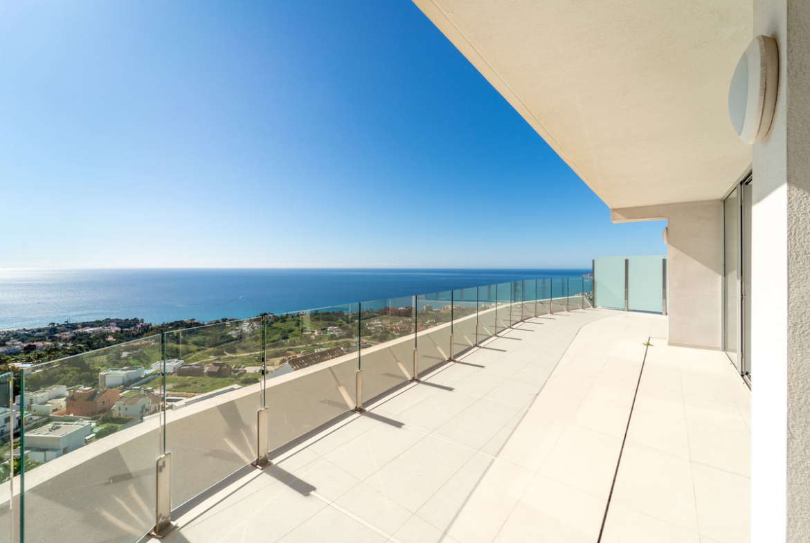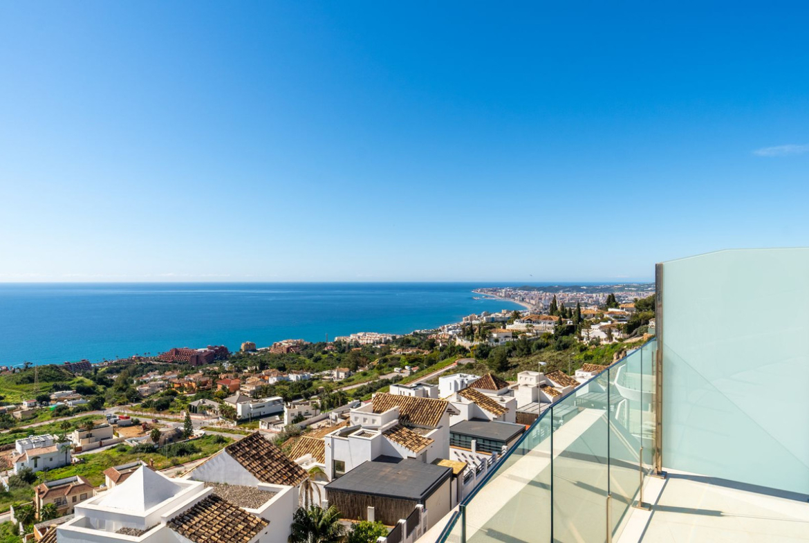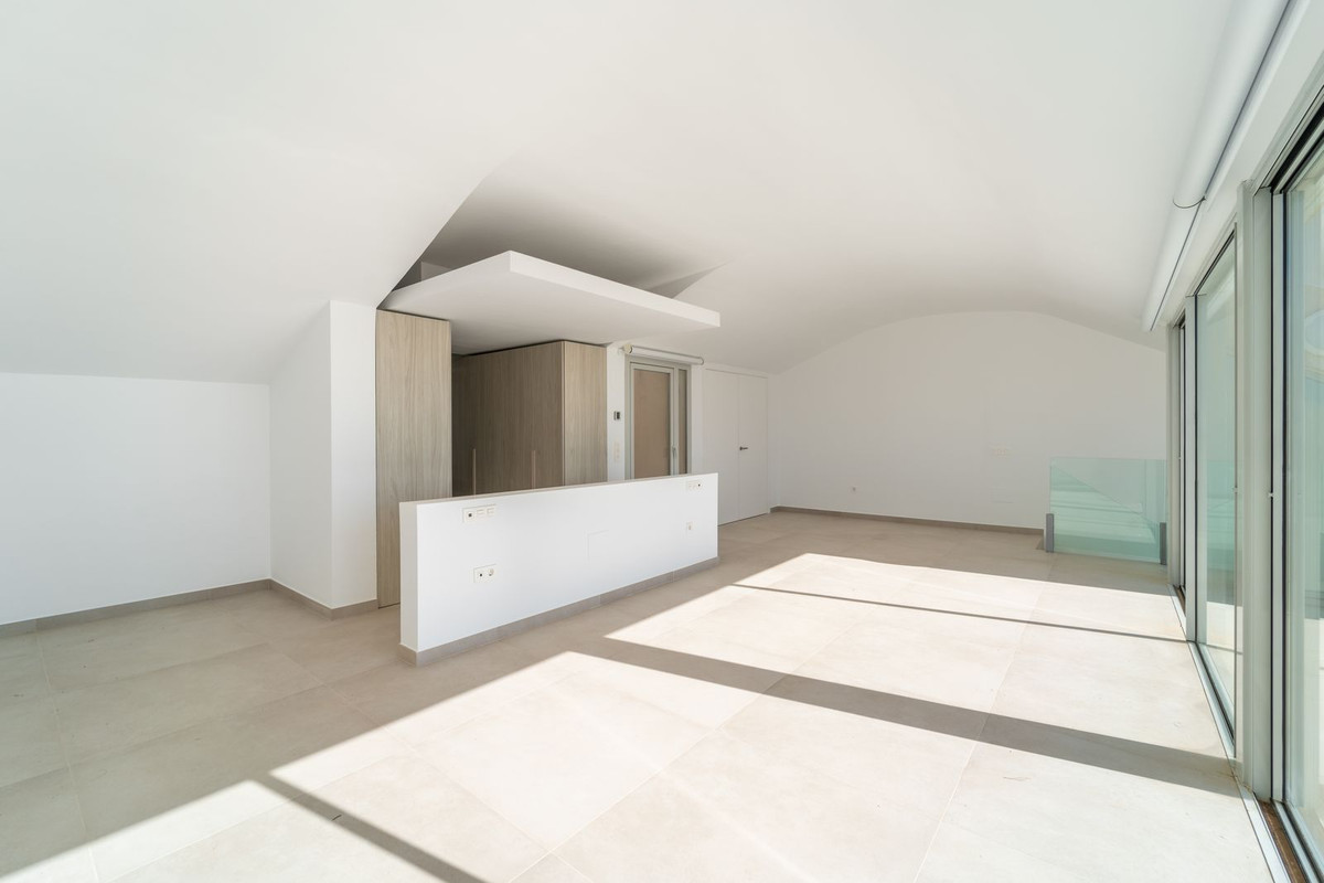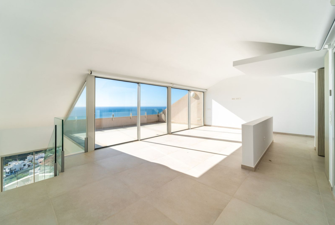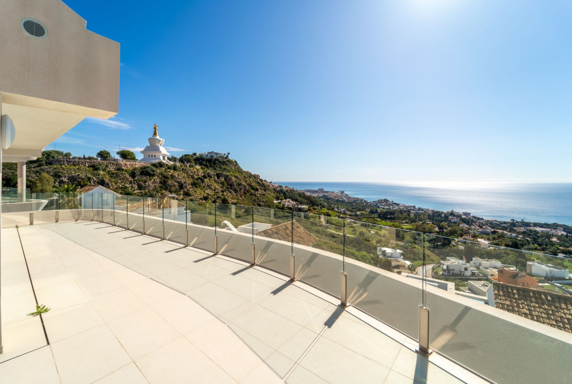 Brand new south facing penthouse duplex, located in the exclusive urbanization of Stupa Hills. The property consists of hall, 3 bedrooms with built-in wardrobes and electric blinds, bathroom and guest toilet, open plan kitchen fully furnished and equipped with electricial appliances from Siemens. Spacious living-dining room that leads out to a terrace of 65m2 with panoramic sea views, the Fuengirola Bay and of the Buddist Temple. On the top floor is located the main bedroom with walk-in closet, ensuite bathroom and laundry area. The bedroom leads out to a terrace of 21m2 with panoramic sea views. Air conditioning hot and cold with Airzone, video intercom, domotic system, pre-installation alarm system. Includes two parking spaces and one storage room.