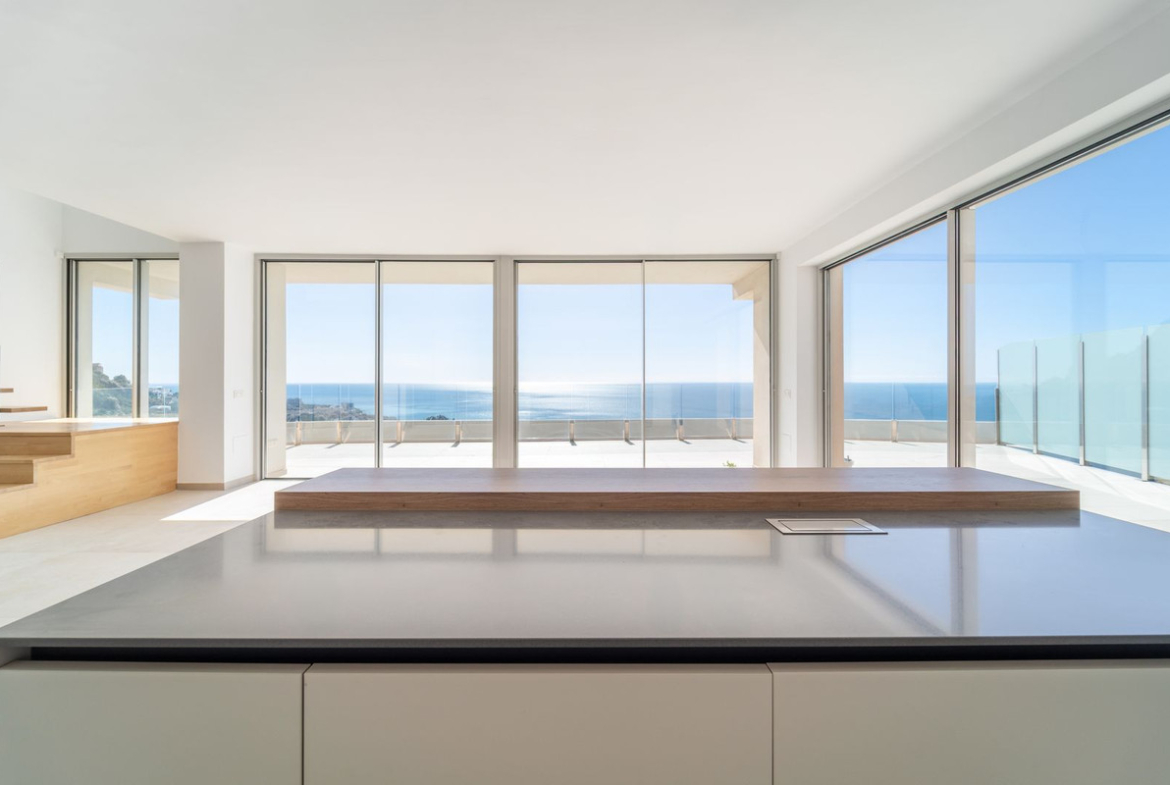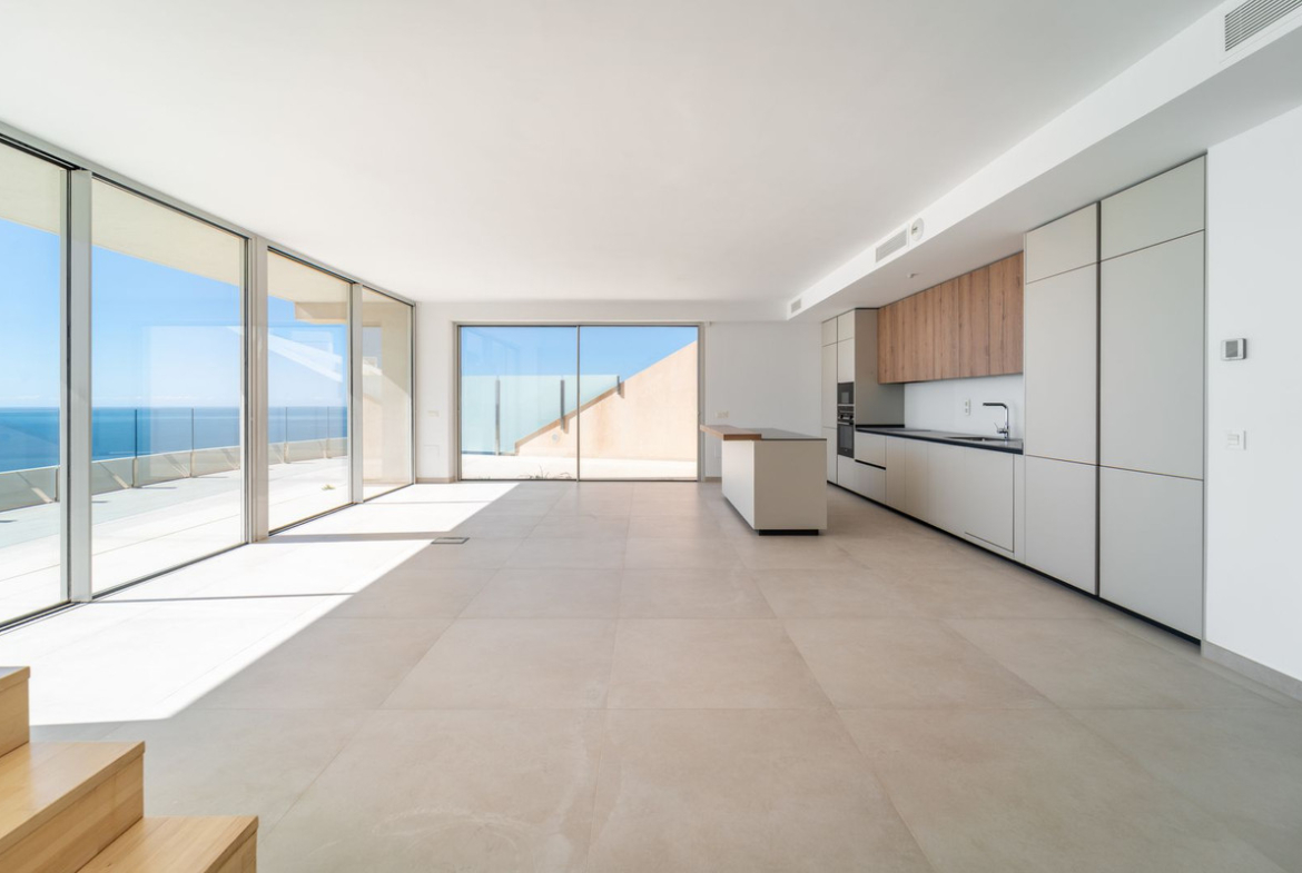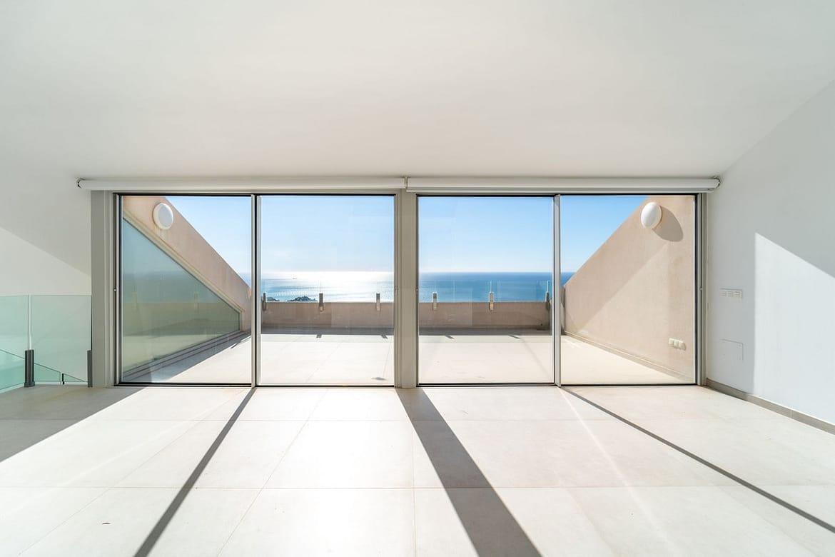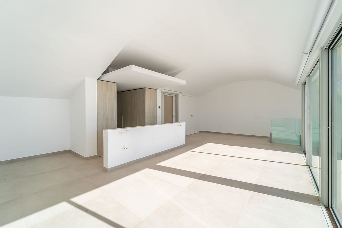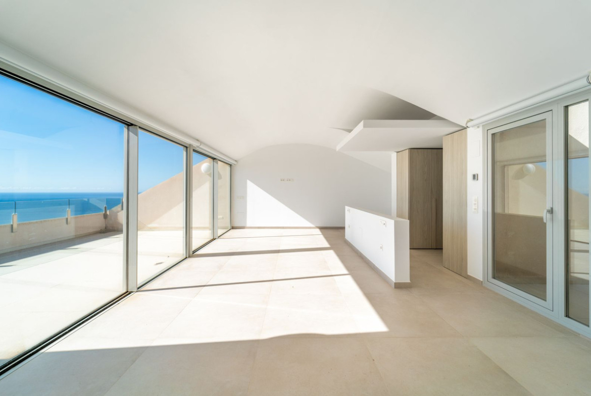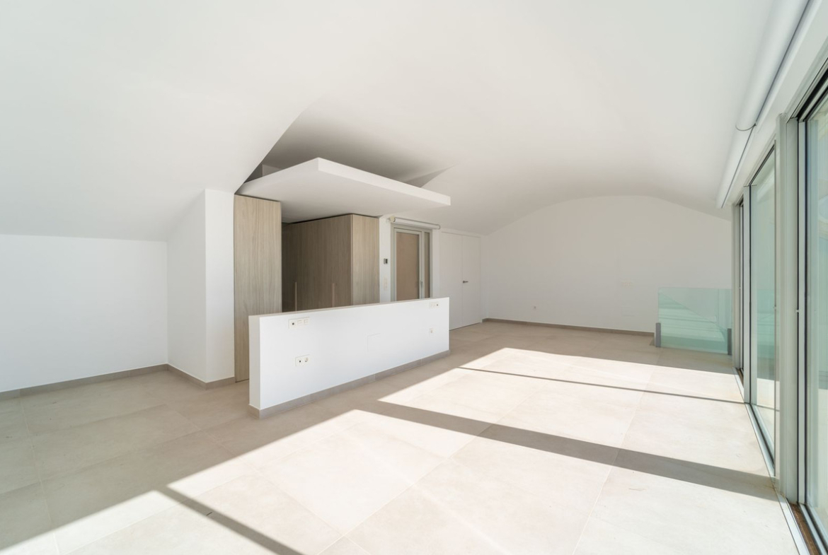 Brand new south facing penthouse duplex, located in the exclusive urbanization of Stupa Hills. The property consists of hall, 3 bedrooms with built-in wardrobes and electric blinds, bathroom and guest toilet, open plan kitchen fully furnished and equipped with electricial appliances from Siemens. Spacious living-dining room that leads out to a terrace of 65m2 with panoramic sea views, the Fuengirola Bay and of the Buddist Temple. On the top floor is located the main bedroom with walk-in closet, ensuite bathroom and laundry area. The bedroom leads out to a terrace of 21m2 with panoramic sea views. Air conditioning hot and cold with Airzone, video intercom, domotic system, pre-installation alarm system. Includes two parking spaces and one storage room.