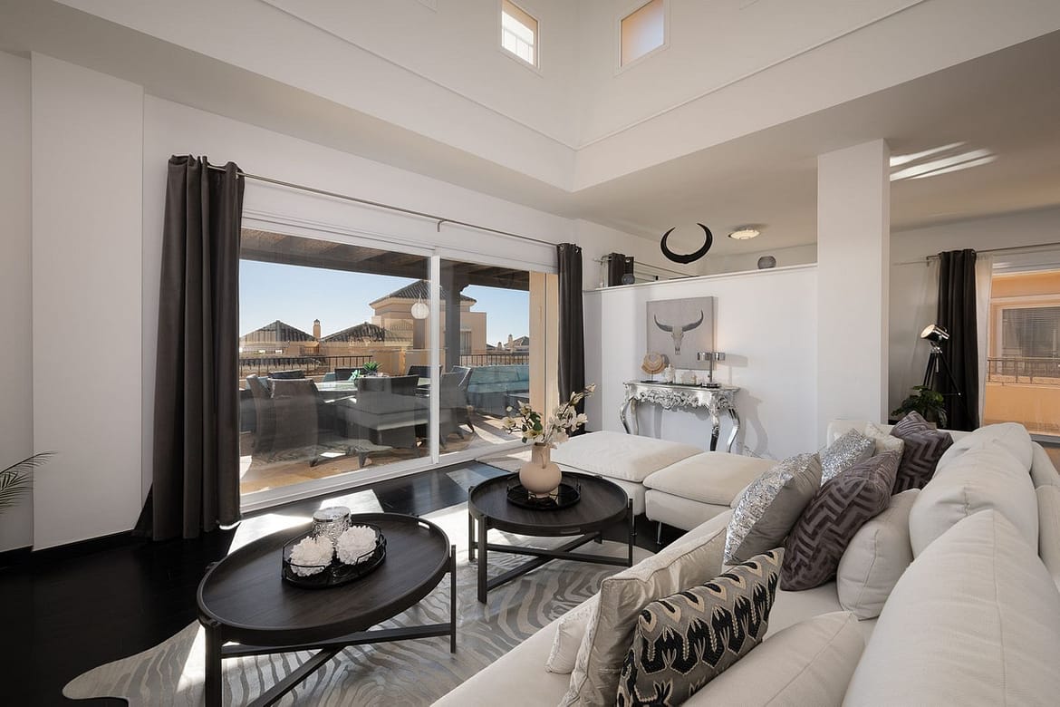 Upon entering the penthouse from either the garage or the main entrance, the private elevator opens into a welcoming foyer that leads into a bright and airy living room with soaring ceilings, creating a sense of openness and elegance. This level also includes a formal dining area, and a contemporary, open-plan kitchen equipped with high-end appliances, including a professional ice maker. A large wraparound terrace encircles the entire apartment, offering over 200 m² of outdoor space and direct access to the community pools.