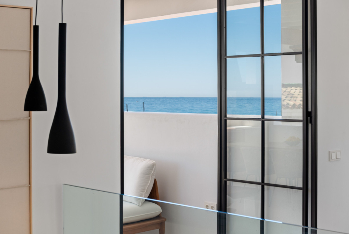 Distributed over two floors, the property offers four spacious bedrooms, three full bathrooms (two of them en suite), and a guest toilet. The residence has been completely renovated with high-quality materials and is delivered fully furnished and ready to move in. The modern and functional kitchen opens to the living-dining room in an open-plan space that connects to an uncovered terrace with impressive panoramic views of the sea, the coastline, and the marina.