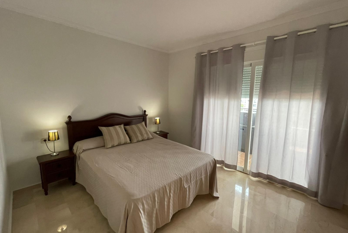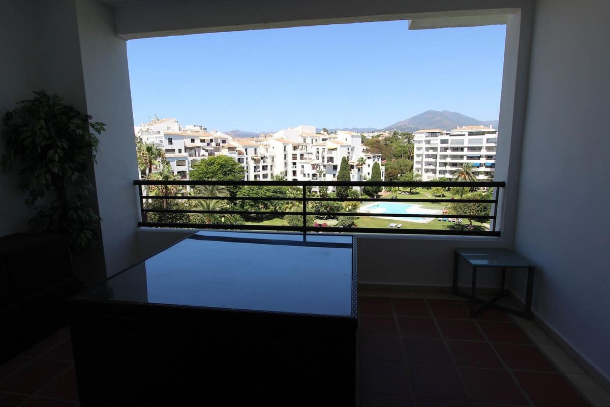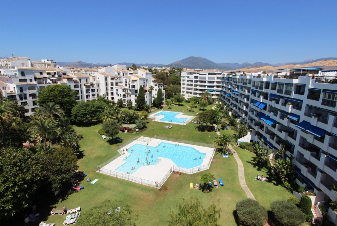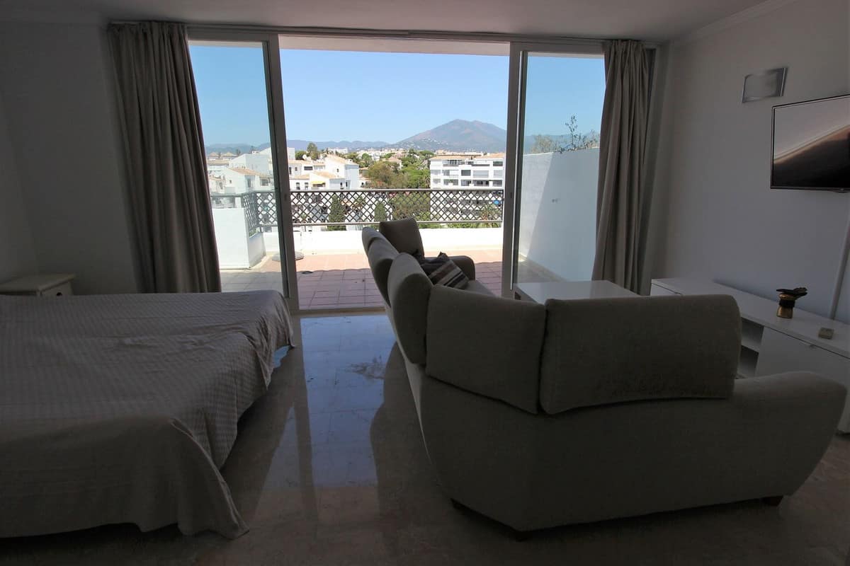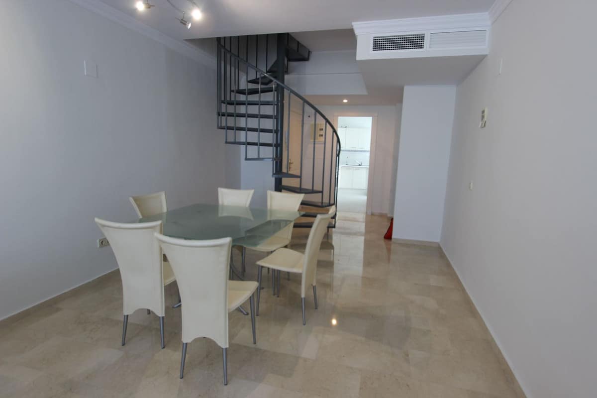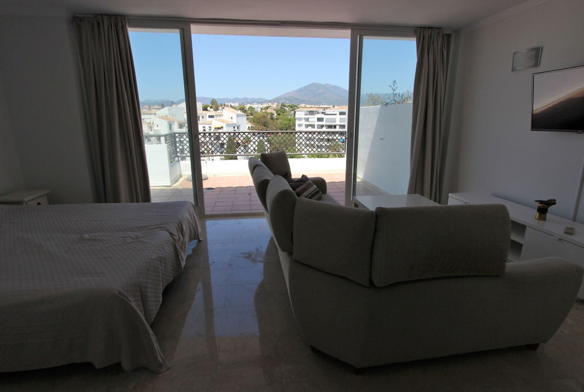 Ideal location for this 4 bed duplex penthouse property located in the heart of the famous Puerto Banús, surrounded by shops, bars and restaurants and with beaches only a few minutes walk away, no need for a car. The complex offers mature communal gardens, 3 swimming pools and tennis courts. The accommodation consists of 4 bedrooms with 4 bathrooms (3 en-suite) and can therefore accomodate 8 people. Downstairs is distributed in a large livingroom-diningroom with access to a covered terrace overlooking the beautiful gardens and pools, a fully fitted kitchen with utility room (with washer and dryer), a master bedroom with en-suite bathroom with access to the terrace and another bedroom with double bed with seperate bathroom. Upstairs you will find a large master suite which counts with its own livingroom with satellite TV, en-suite bathroom and large windows opening up to the wrap-around solarium with panoramic views, and another very large bedroom with two small beds and en-suite bathroom. The property comes with a private parking space and counts with air conditionning throughout the whole apartment, satelitte TV with large flat screen TVs upstairs and downstairs, (for rentals: wifi and travel cot & high chair for a baby).