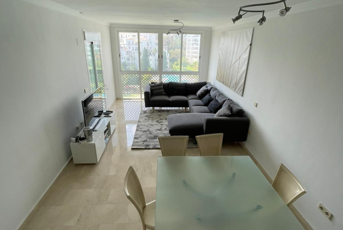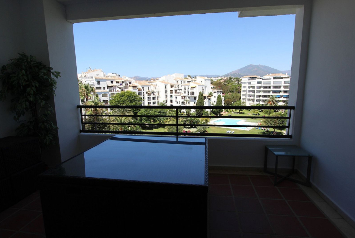 Ideal location for this 4 bed duplex penthouse property located in the heart of the famous Puerto Banús, surrounded by shops, bars and restaurants and with beaches only a few minutes walk away, no need for a car. The complex offers mature communal gardens, 3 swimming pools and tennis courts. The accommodation consists of 4 bedrooms with 4 bathrooms (3 en-suite) and can therefore accomodate 8 people. Downstairs is distributed in a large livingroom-diningroom with access to a covered terrace overlooking the beautiful gardens and pools, a fully fitted kitchen with utility room (with washer and dryer), a master bedroom with en-suite bathroom with access to the terrace and another bedroom with double bed with seperate bathroom. Upstairs you will find a large master suite which counts with its own livingroom with satellite TV, en-suite bathroom and large windows opening up to the wrap-around solarium with panoramic views, and another very large bedroom with two small beds and en-suite bathroom. The property comes with a private parking space and counts with air conditionning throughout the whole apartment, satelitte TV with large flat screen TVs upstairs and downstairs, (for rentals: wifi and travel cot & high chair for a baby).