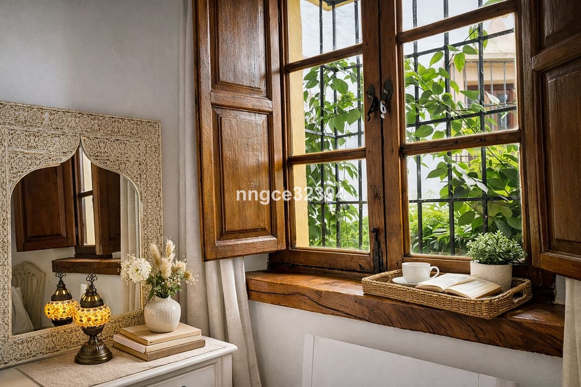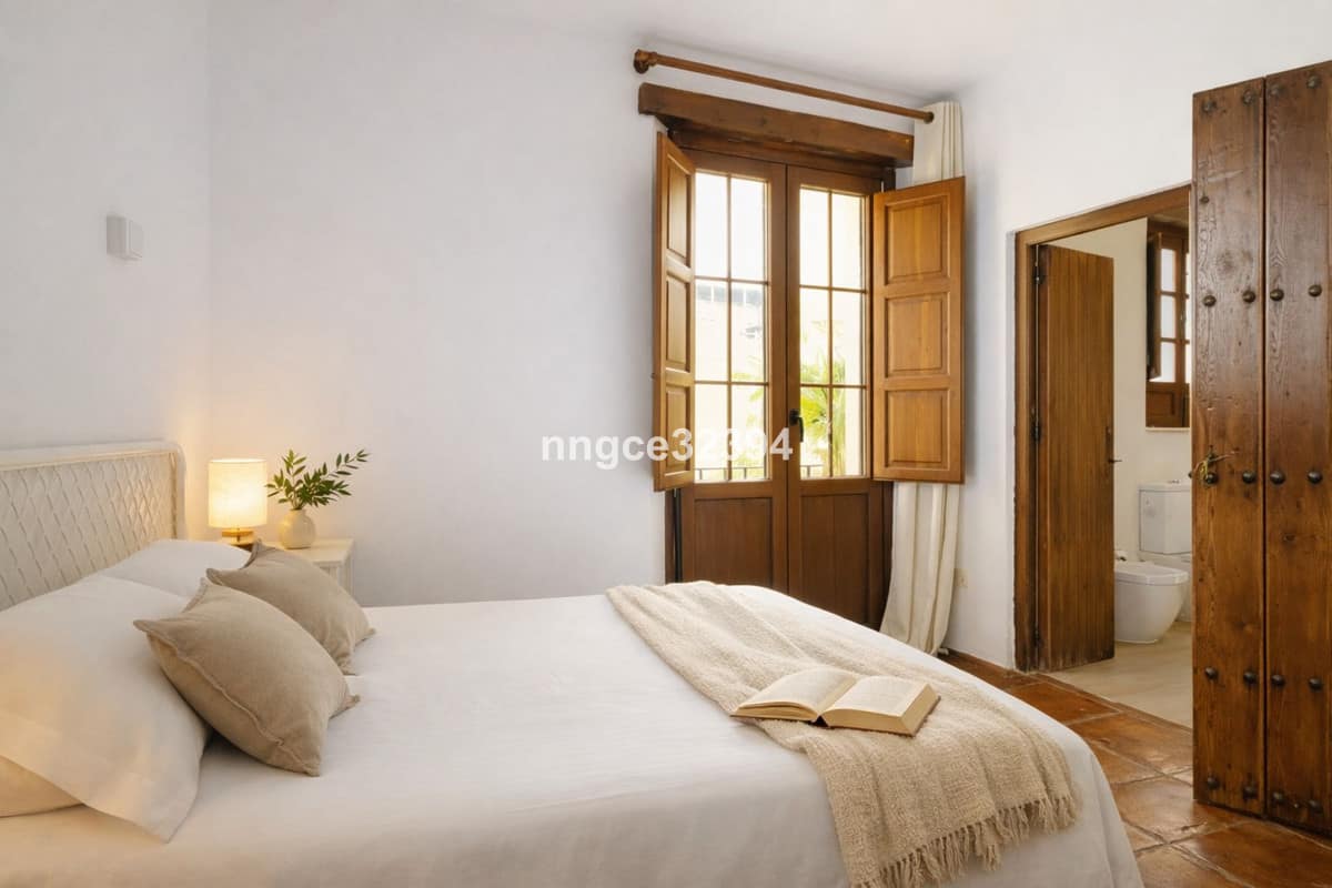 The upper levels host well-proportioned bedrooms, including a primary suite with ensuite bathroom, all retaining original Andalusian details such as wooden shutters and natural materials throughout.