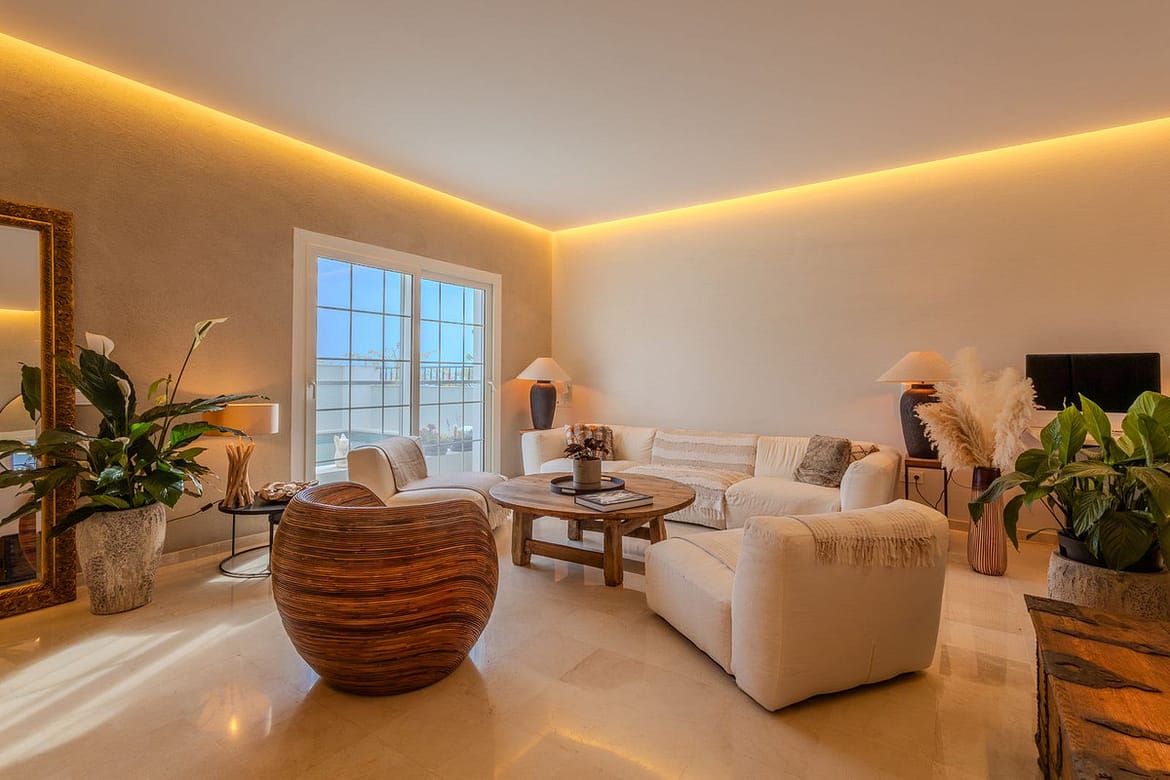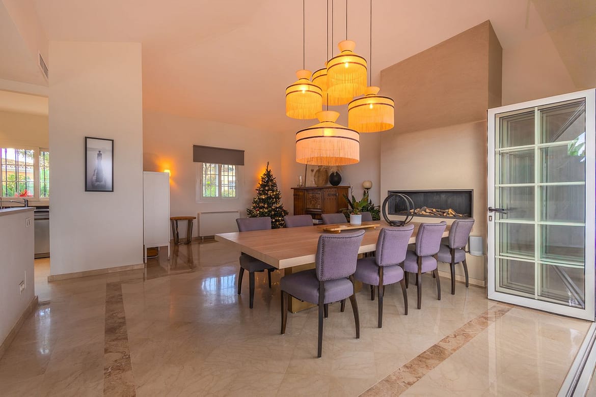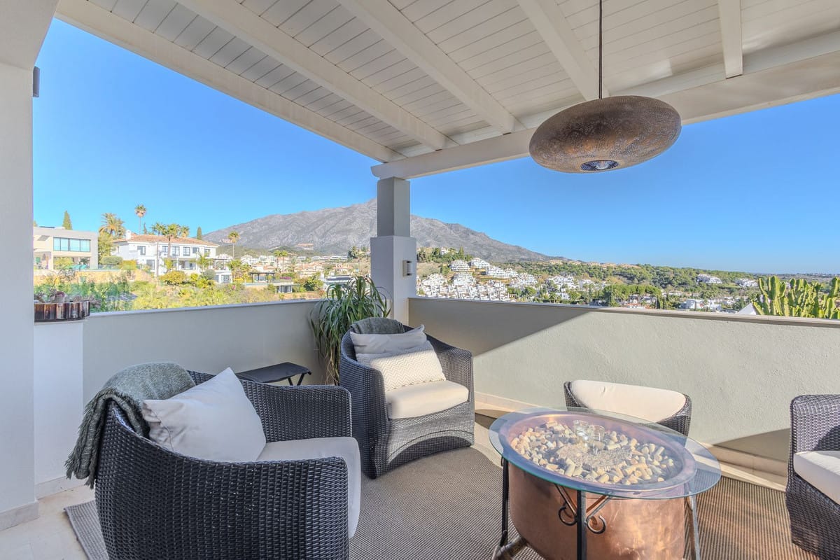 Elegant View Residence in La Cerquilla, Nueva Andalucía Located in the prestigious and secure gated community of Aldea Dorada, this semi-detached residence offers the ease of a townhouse with the elevated presence of a penthouse, set in one of Nueva Andalucía’s most exclusive and tranquil locations. From its privileged position, the property enjoys exceptional panoramic views across the Mediterranean Sea, the Golf Valley, and the iconic La Concha Mountain—widely considered among the finest views in Nueva Andalucía and the defining feature of the home. Behind a classic Andalusian façade, the interior reveals a warm and refined Japandi-style renovation, featuring high ceilings, open-plan living spaces, and modern bathrooms that create a calm and elegant atmosphere. The entrance level offers an open living and dining area with a striking suspended fireplace, a discreet office space, and direct access to a partly covered terrace designed to fully embrace the views. The home offers 300 m² built, 76 m² of terraces, and a 300 m² private garden with avocado, mango, and passion fruit trees. A plunge pool on the upper terrace delivers a true penthouse-style outdoor experience. The property comprises four bedrooms and three bathrooms, with excellent potential to create a luxurious master suite with walk-in wardrobe and en-suite bathroom. Additional features include a private gym, two large storage rooms, covered parking for two cars, and lower-level terraces with direct access to the garden. A rare opportunity for buyers seeking a secure, semi-detached luxury home with breathtaking views and effortless maintenance.