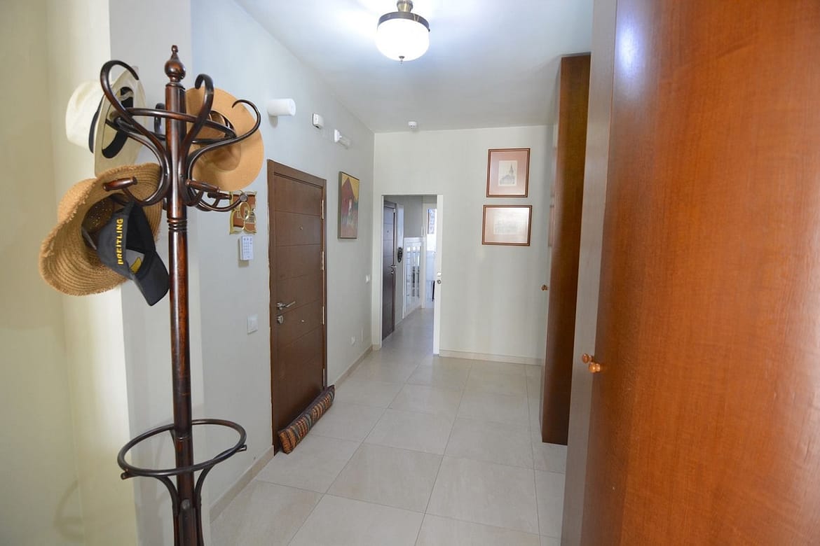 The kitchen is fully fitted and equipped with high-end appliances, complemented by a large pantry and a separate laundry area. The home also features modern cream-colored porcelain stoneware flooring, air conditioning (hot/cold) throughout, and two separate entrances: a main entrance and a service entrance.