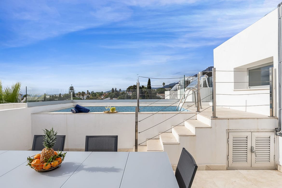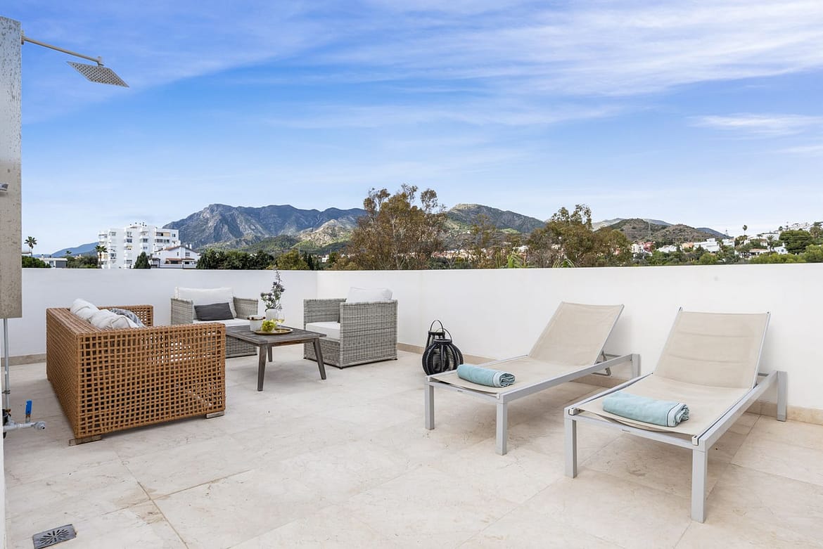 The true highlight awaits upstairs: a spectacular private rooftop terrace with a plunge pool, sunbeds, dining area, and furniture. From here, enjoy breathtaking open views and soak up the Marbella sunshine in complete privacy.
