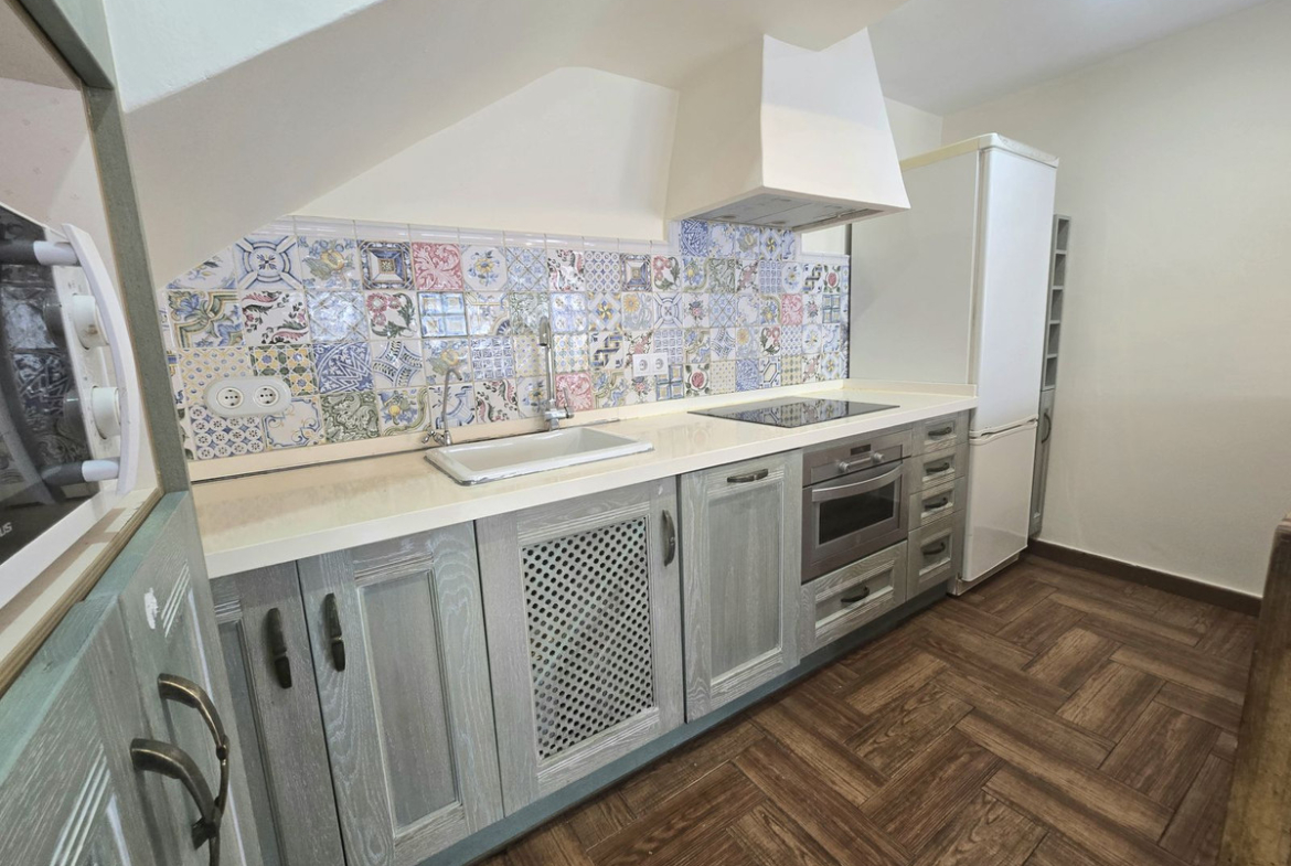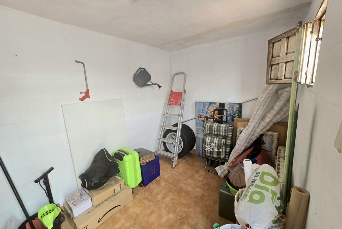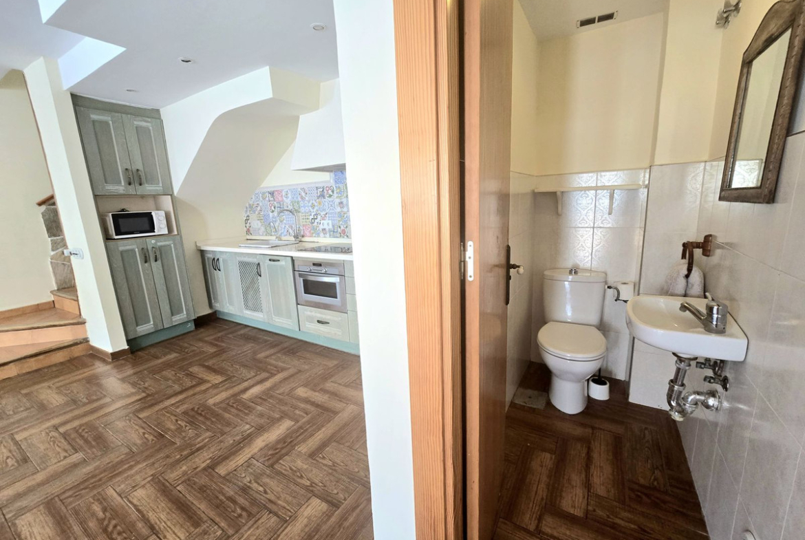 Accessed through a large patio with a separate office or storage room. Inside, there is a spacious living-dining room with large windows and a fully equipped open-plan kitchen, as well as a guest toilet. The south-east orientation ensures light throughout the day.