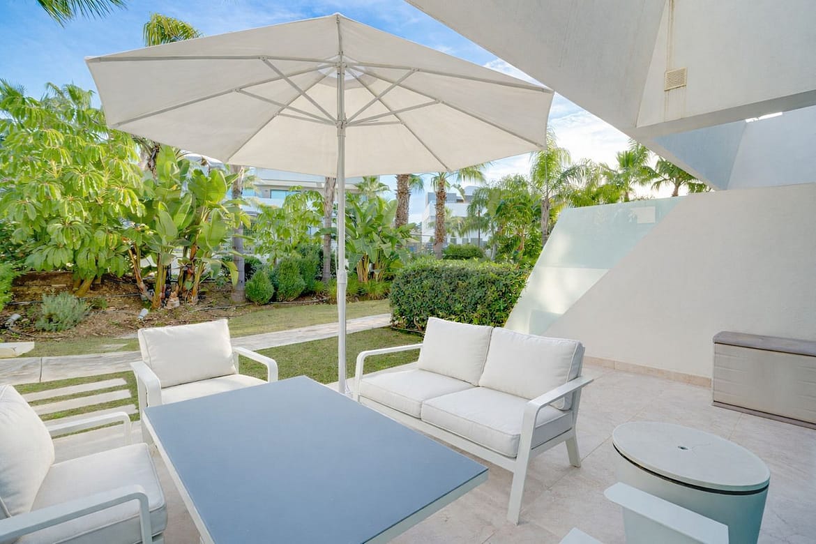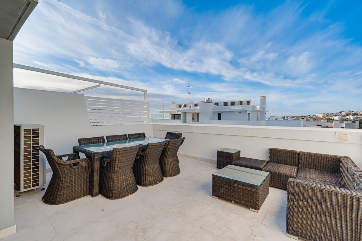 Exceptional four-bedroom townhouse located in an exclusive boutique development of just 48 contemporary luxury townhouses, set on an elevated plot in La Cala de Mijas. The gated community is surrounded by beautifully landscaped tropical gardens and offers three communal swimming pools. Ideally positioned within walking distance to the beach and the vibrant town centre of La Cala. The ground floor features a bright open-plan living and dining area with a modern fully fitted kitchen, opening onto a private garden with direct access to the communal pool, creating an ideal indoor–outdoor lifestyle. This level also includes a guest bedroom and a full bathroom. On the first floor, the property offers a spacious master suite with a private terrace, two additional guest bedrooms, and a stylish shared bathroom. The upper level leads to a generous private solarium, complete with a plunge pool, perfect for relaxing or entertaining. The lower level provides a large multipurpose room, ideal for a gym, home cinema, games room, or additional living space, along with a laundry room and direct internal access to the garage. Additional features include hot and cold air conditioning, two private parking spaces and concierge service. This property offers a perfect combination of contemporary design, comfort, and a prime coastal location with short term rentals allowed within the community.