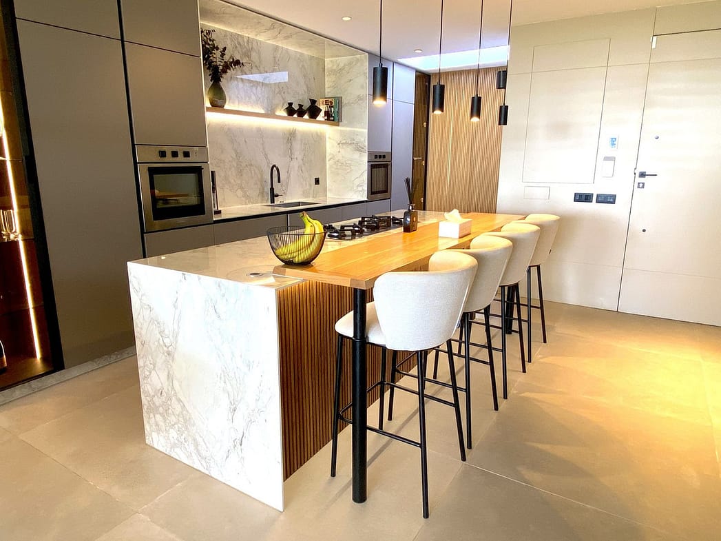 The townhouse is distributed over three levels and has been completely modernised. The entrance level features a welcoming hall leading to a bright open-plan living and dining area. The designer kitchen includes a central island and top-quality Barazza appliances, complemented by a separate utility and storage room.