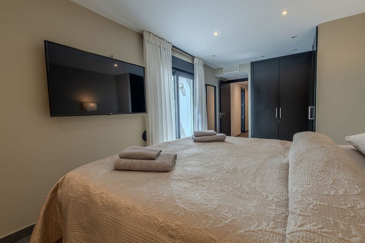 The open-plan living flows effortlessly onto a large south-facing terrace, partly covered for year-round enjoyment, with sweeping sea views and sunshine from morning to evening. High-quality finishes include air conditioning and underfloor heating throughout, ensuring comfort in every season.