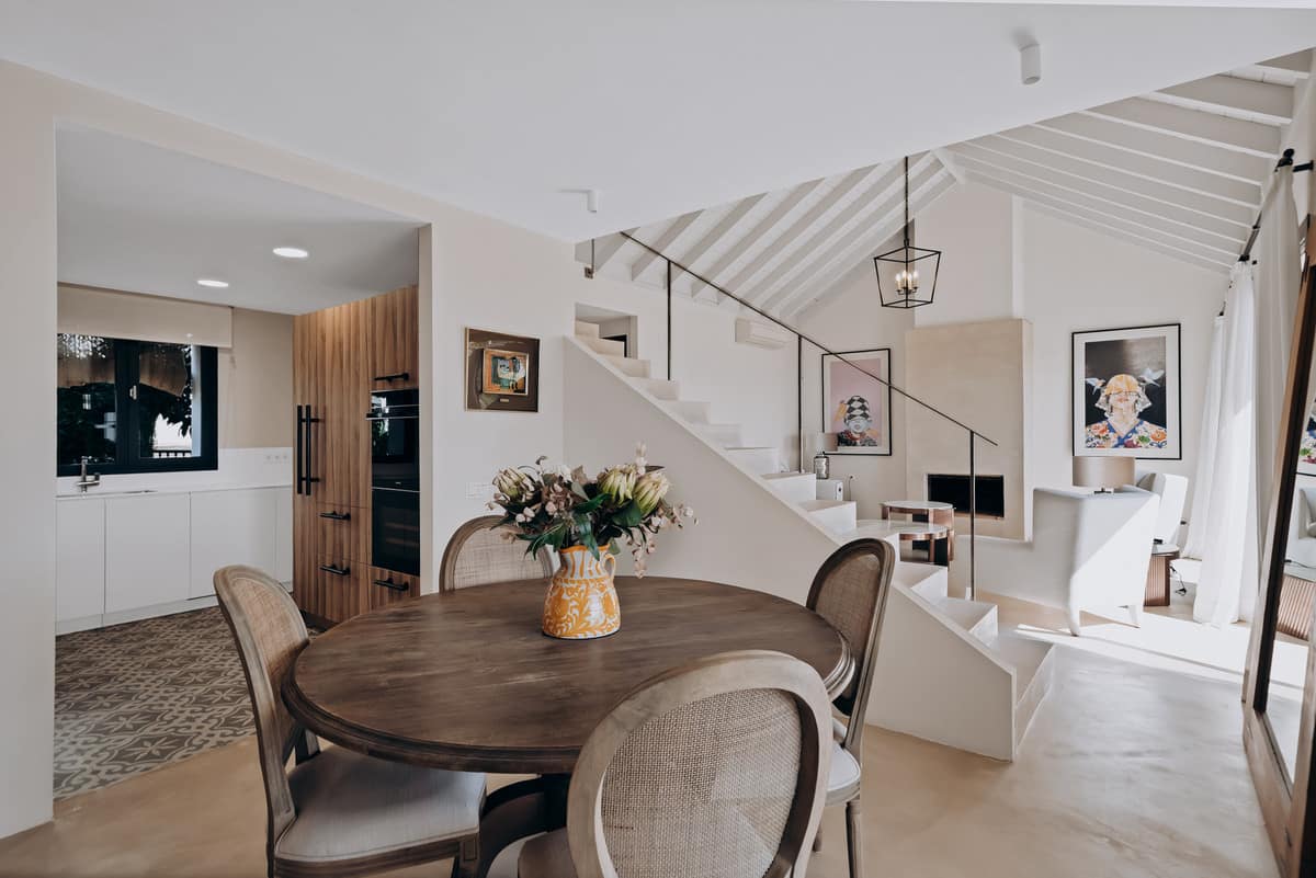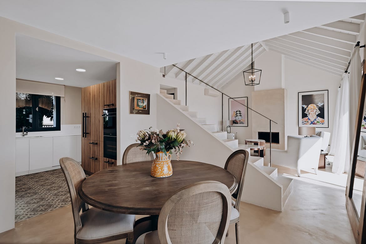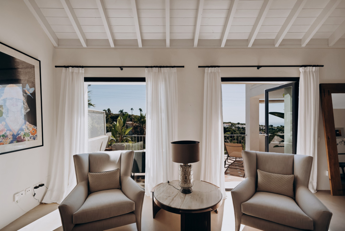 The entrance sets the tone with a private patio shaded by orange trees and flowering plants, creating a welcoming Mediterranean atmosphere. Inside, the main living area impresses with high ceilings, a real fireplace, and uninterrupted sea views from every window and even from the sofa. The modern kitchen, fitted with premium international brands, connects seamlessly to the dining room and opens onto a south-facing terrace with remote-controlled shades – ideal for enjoying Marbella’s mild climate year-round.